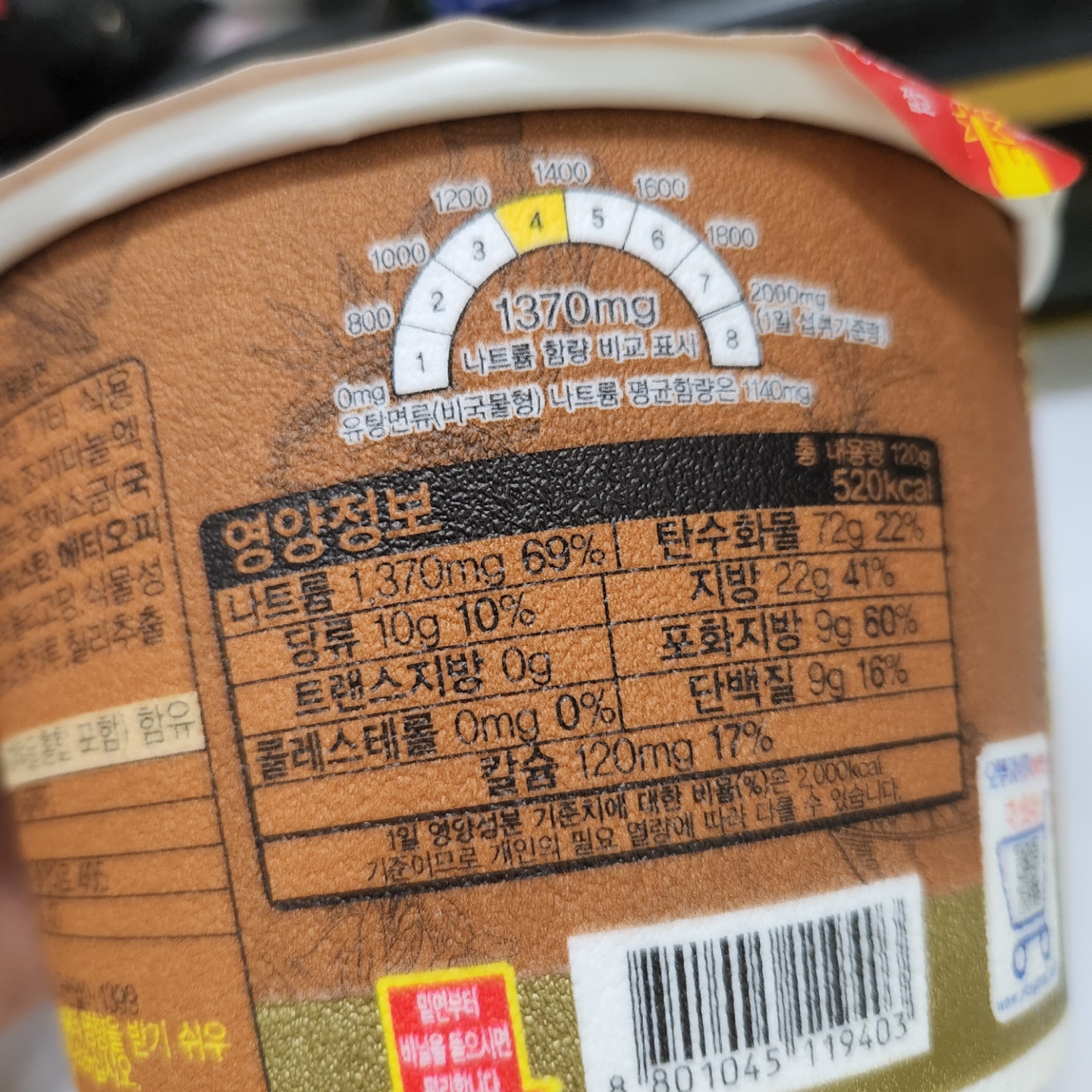 나트륨 함량 1,370mg 유탕면류(비 국물형) 평균치보다 좀 더 많은 나트륨이 들어있네요..
