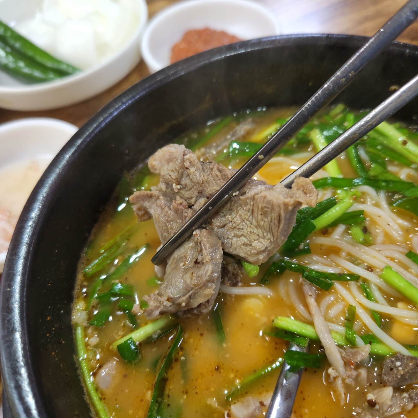 생부추와 소면사리, 김치와 깍두기(남길 거 같아서 안 받았습니다) 등 정갈하게 잘 나오는 거 같아요!