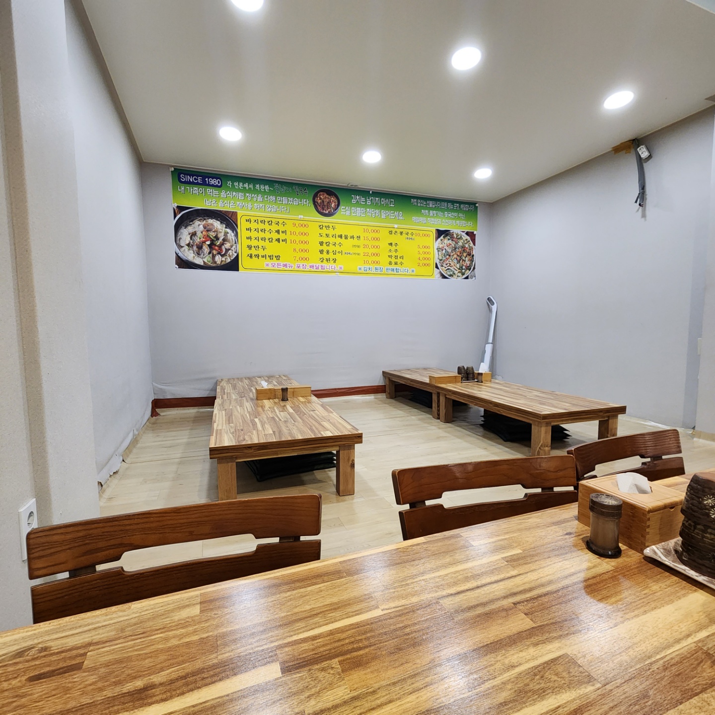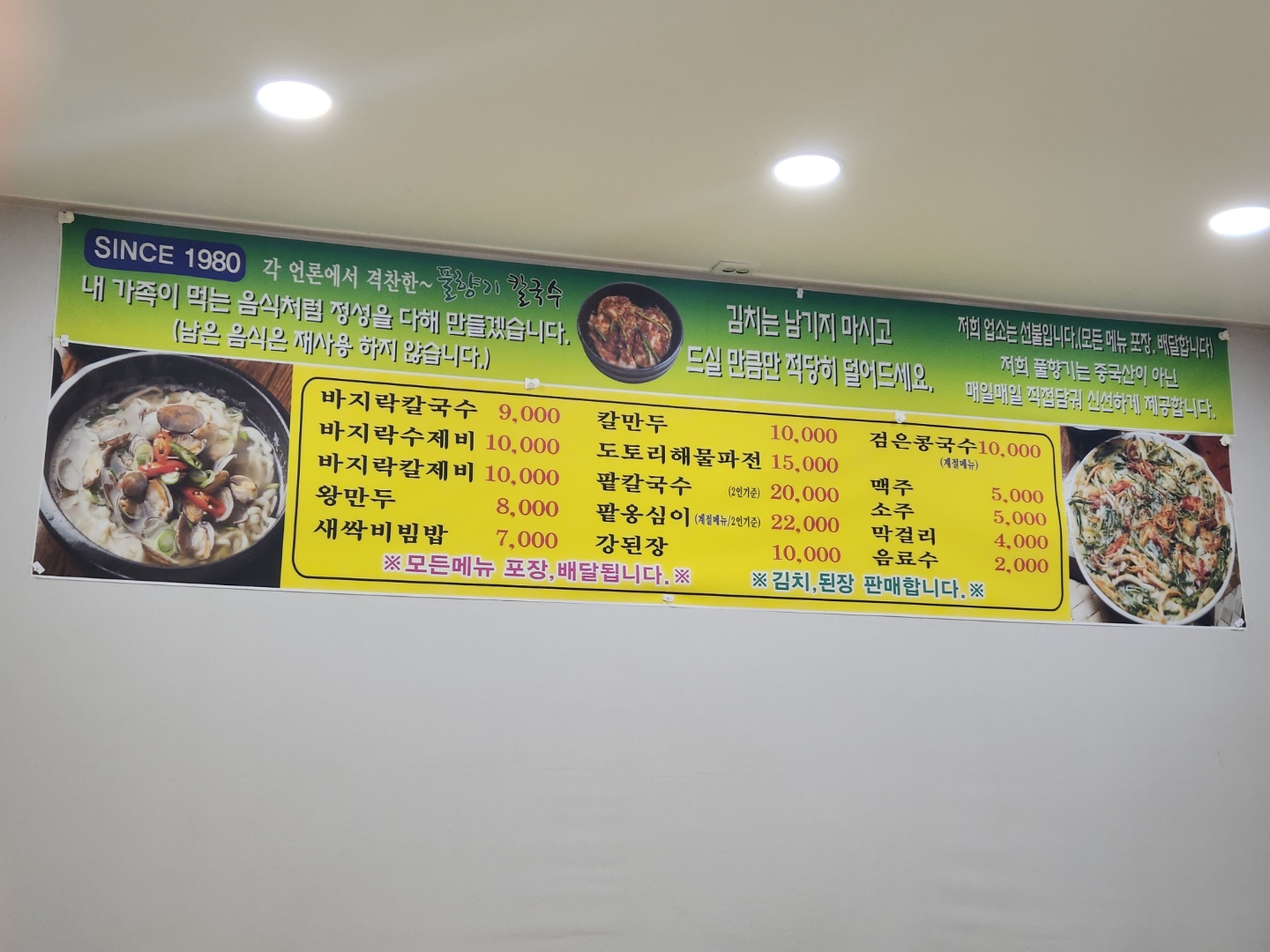 벽면에 붙여진 메뉴를 보시면 됩니다. 이 가게 주메뉴로는 바지락 칼국수이며 수제비도 있네요!