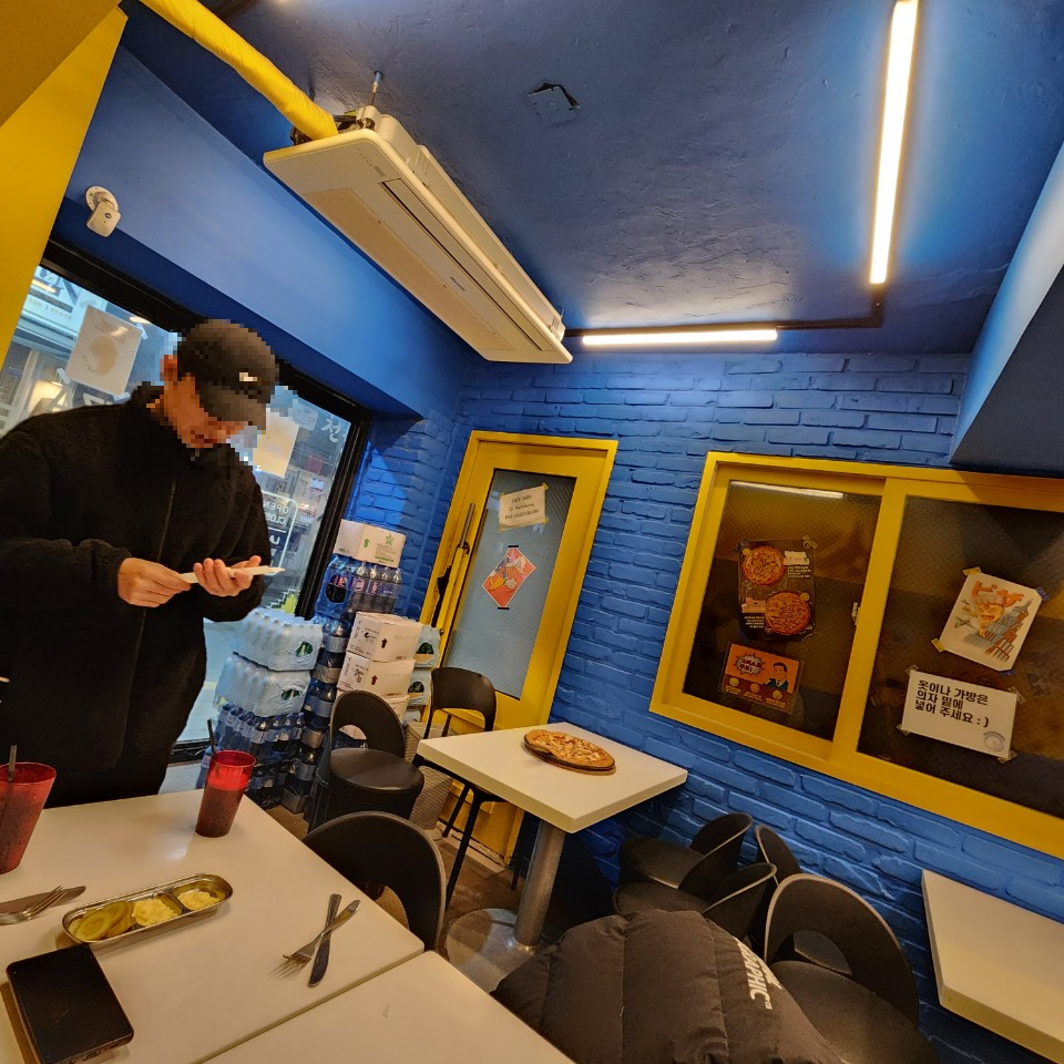 매장 내부는 파란색 페인트 벽지에 노란색으로 칠해진 기둥 및 창틀이 어우러져 아기자기하면서 산뜻한 분위기가 피자 먹기 딱 좋은 공간을 그려낸 거 같아요!