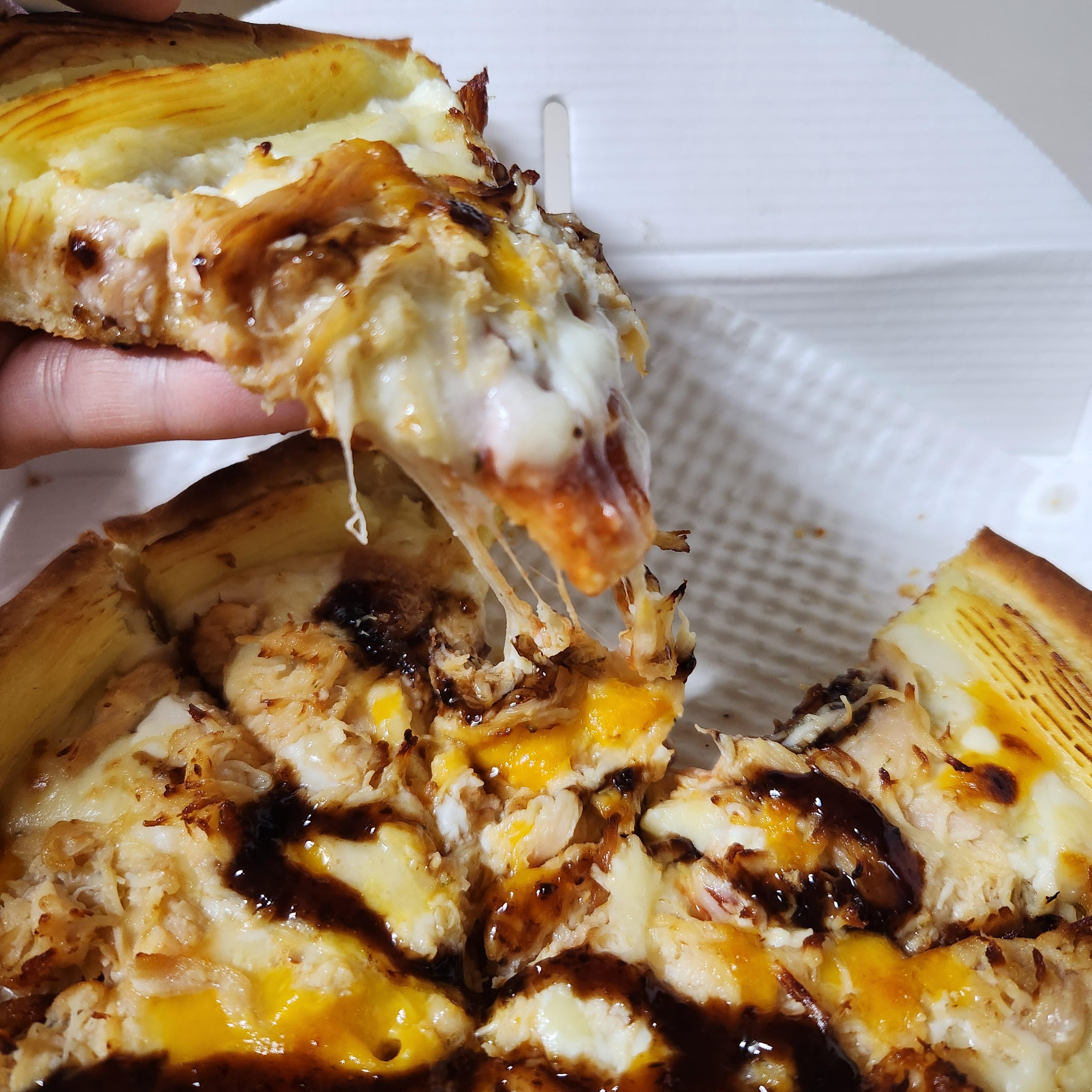 먹으려고 피자 한 조각을 들어 올렸는데 치즈가 쭉 늘어나더니 토핑이 흘러내렸습니다!!