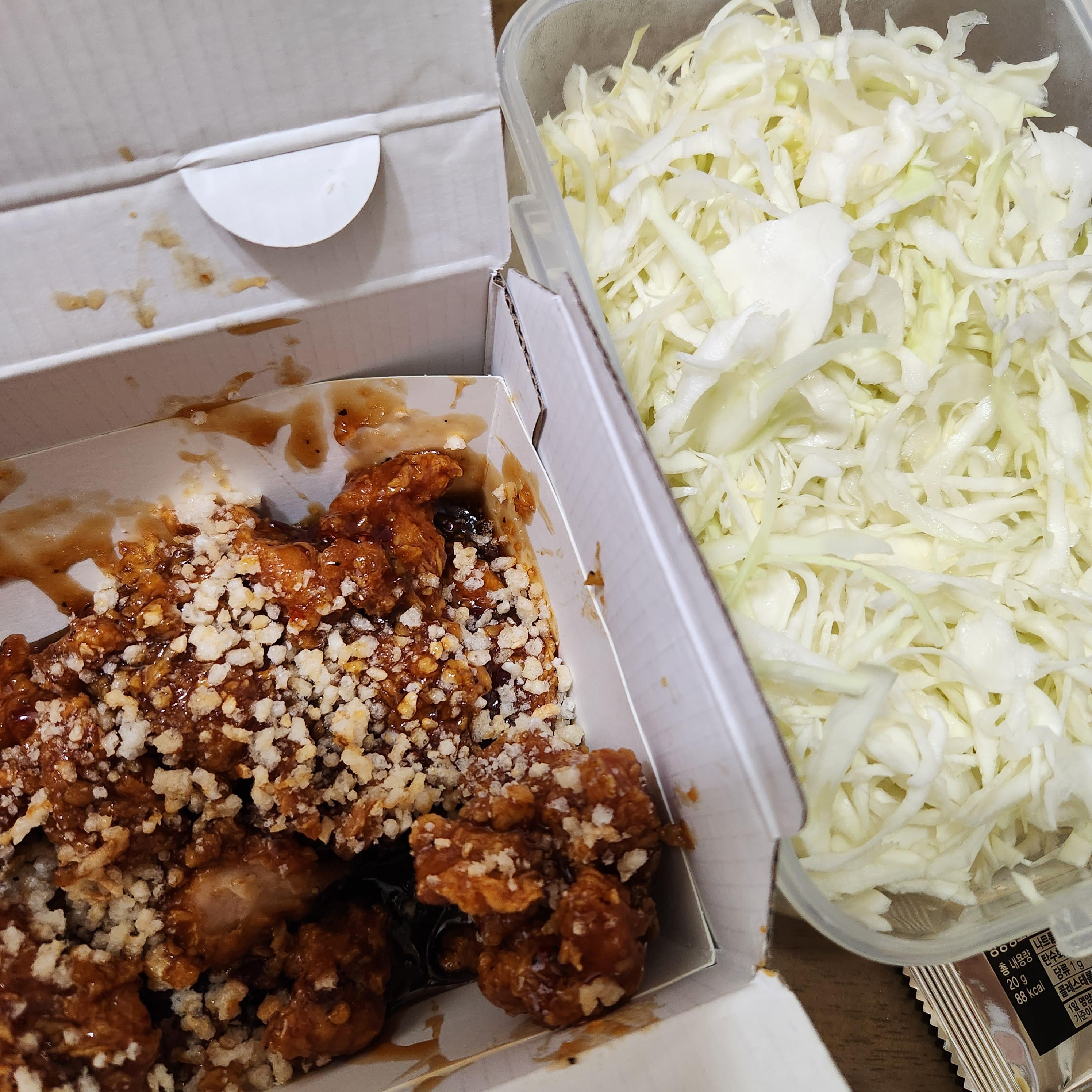 소스가 넉넉하게 들어가 있어서 누룽지 토핑이 순살치킨에 알아서 잘 붙습니다. 그 점 너무 좋았어요~