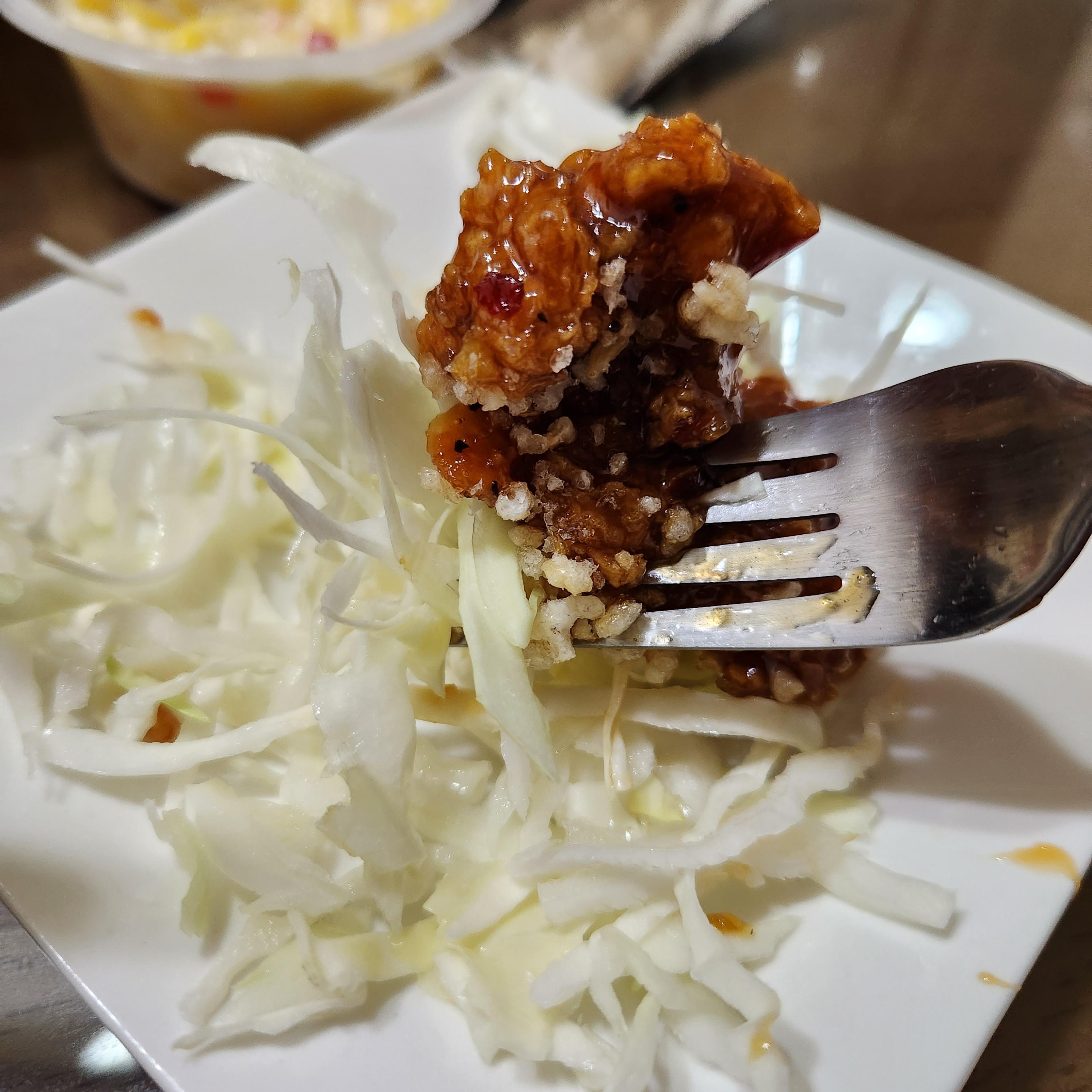 누룽지 없이 한 입 먹어봤습니다. 역시나 꿀간장 소스라 그런지 정말 달달하니 간장 끝판왕인 듯싶어요~
