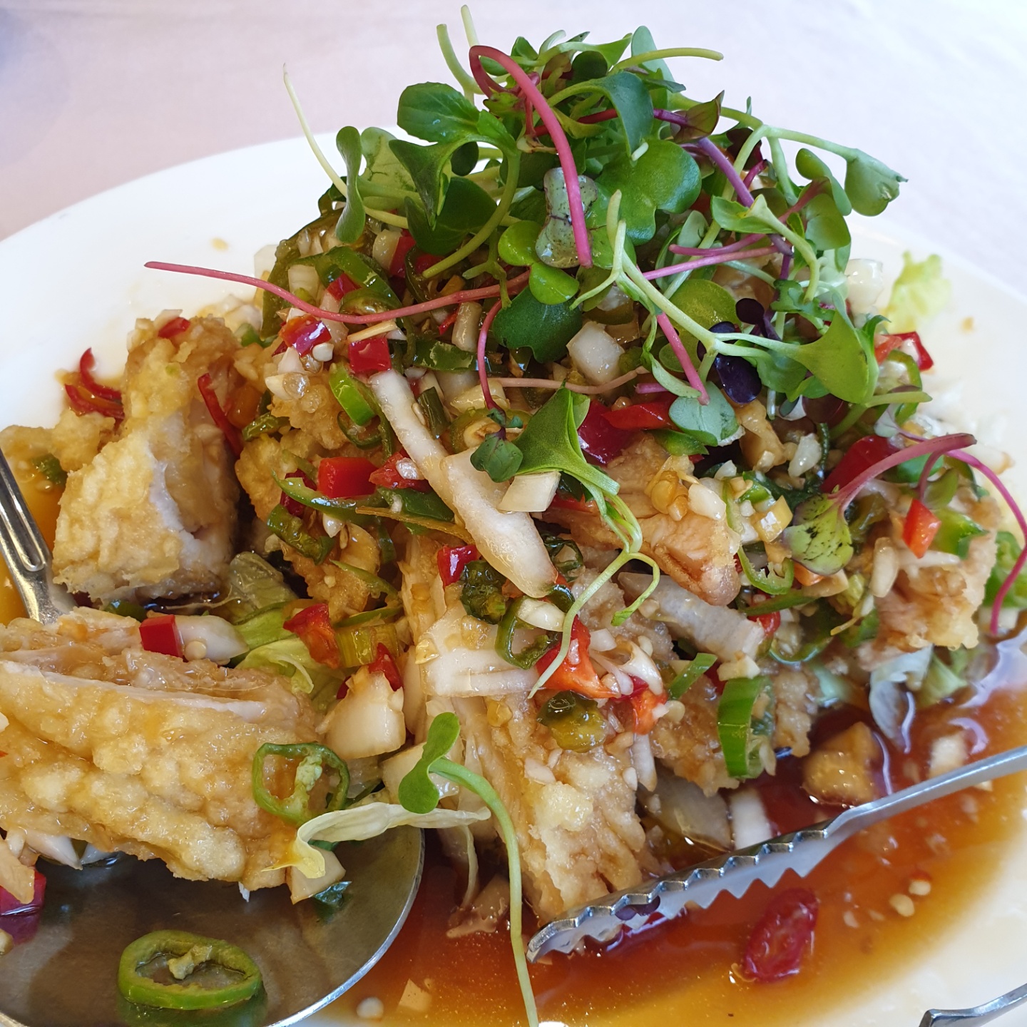 녹말 튀김옷을 입혀 튀긴 닭고기에 파, 마늘, 고추, 식초, 설탕이 들어간 간장 소스를 곁들인 음식입니다!