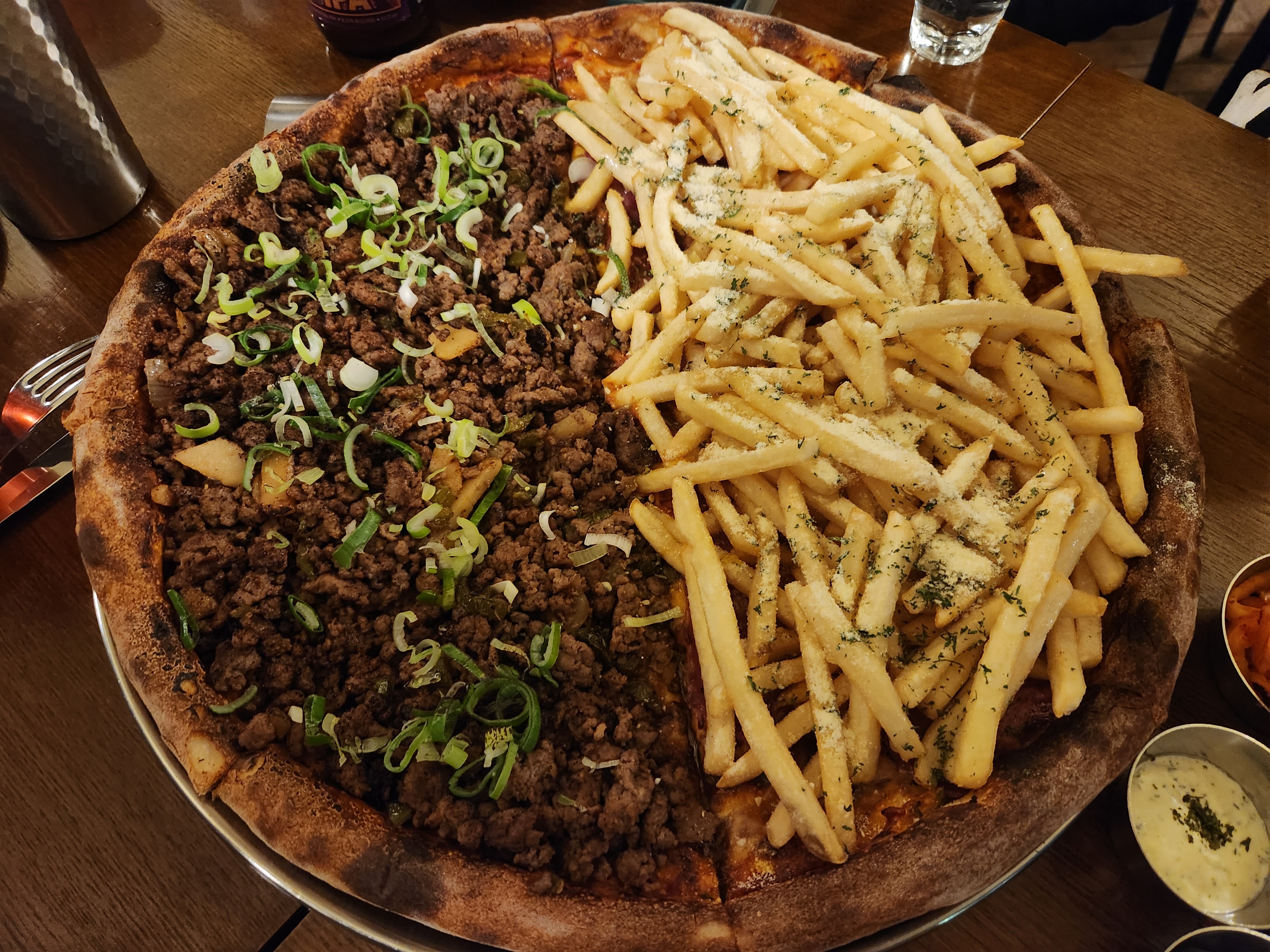 사진에도 보듯이 치즈 피자에 감자튀김을 올려먹는 맛입니다!