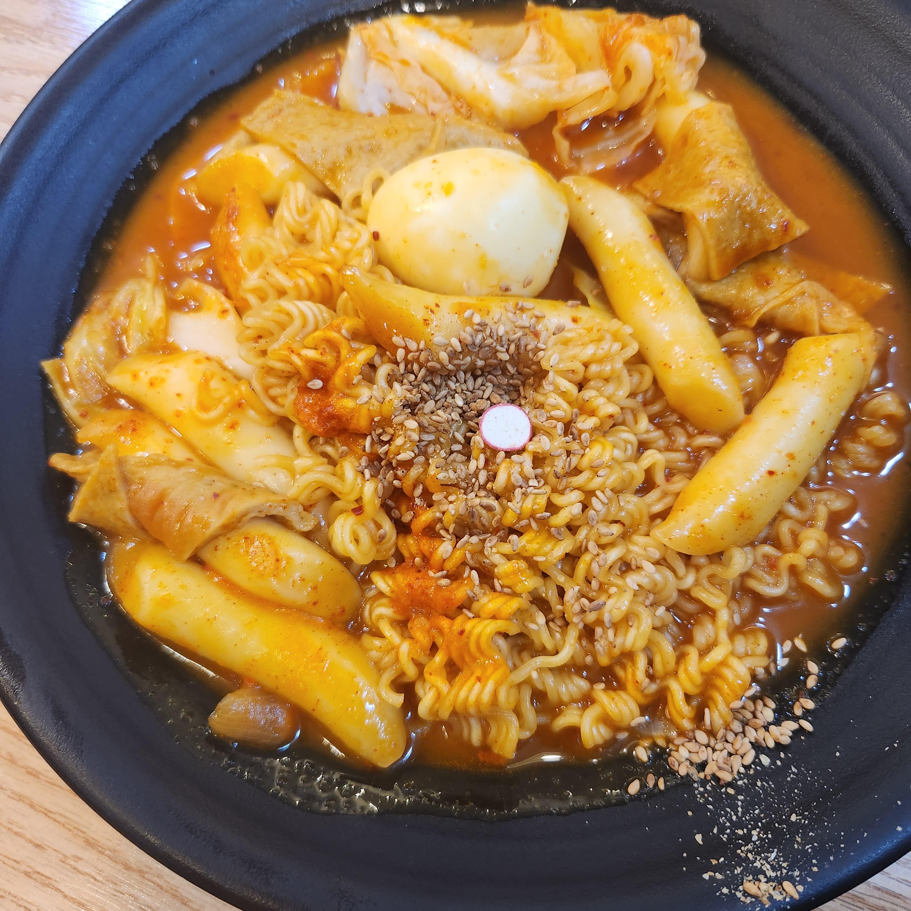계란반 쪽, 떡 몇 개 어묵, 양배추, 라면반 개가 들어가 있으며 약간 캐주얼한 라볶이 느낌입니다.