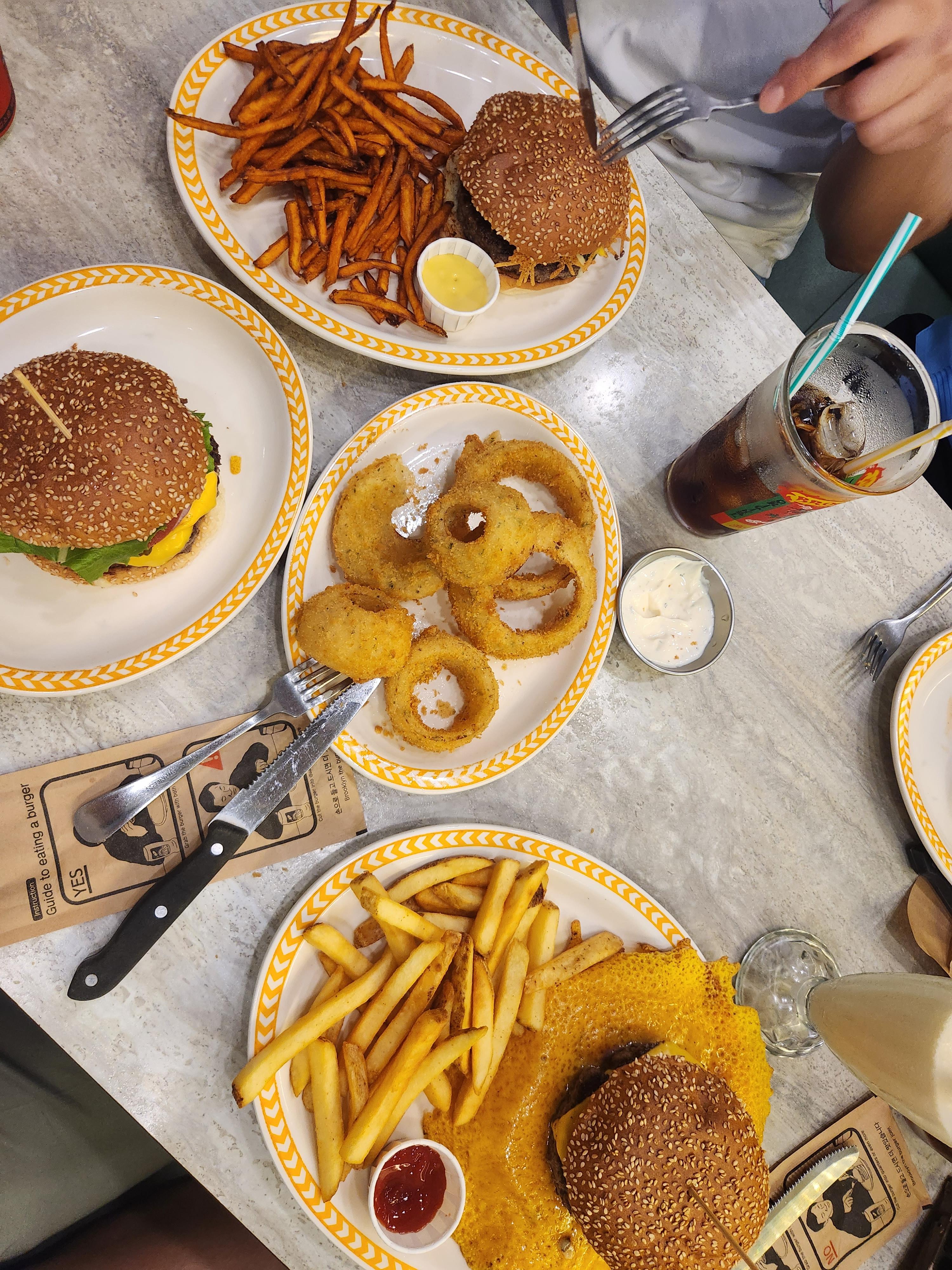 다양하게 먹고자 여러 종류의 수제버거와 사이드 어니언 링을 주문했습니다!