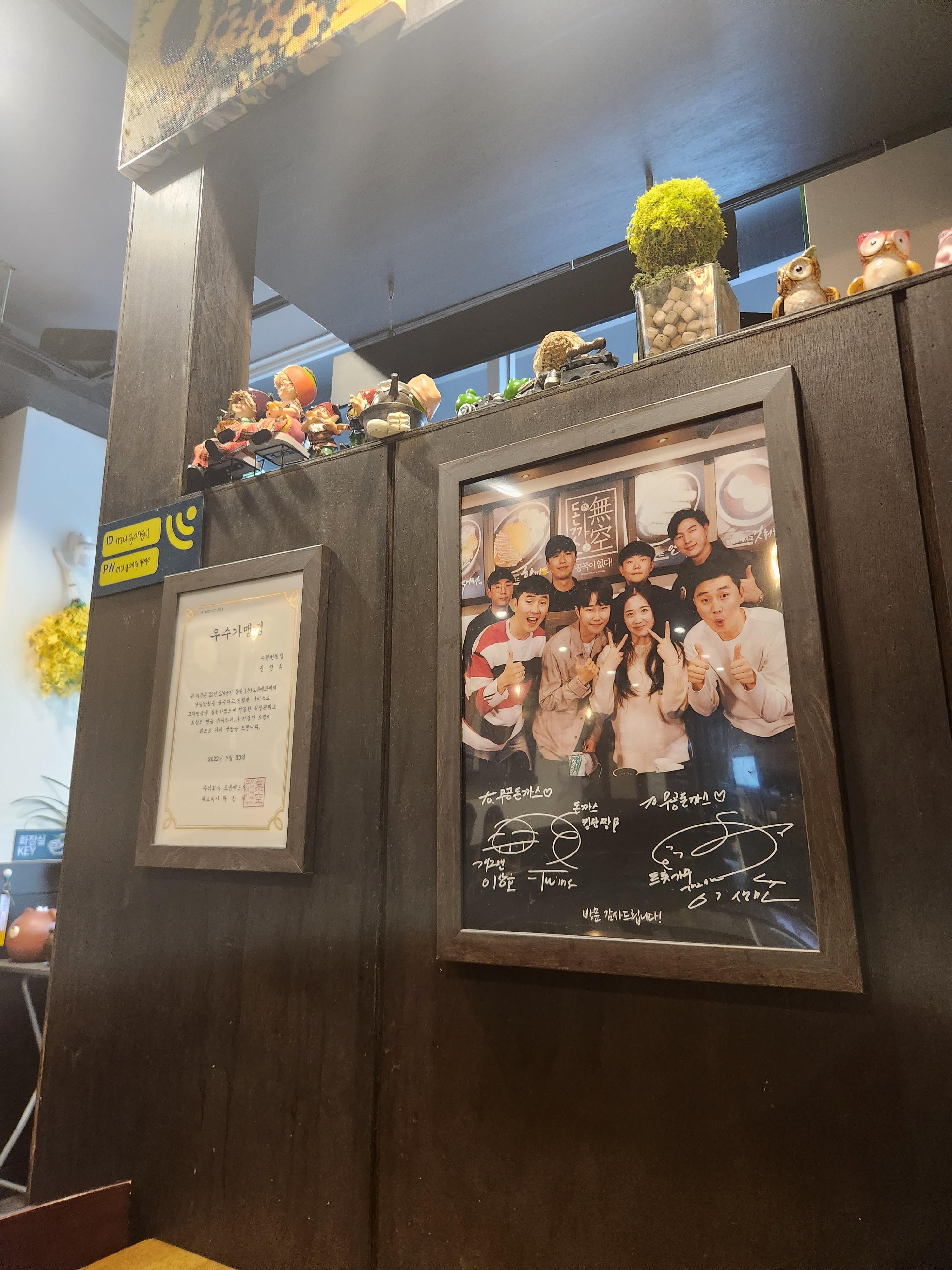 우수가맹점 명판과 여럿 연예인들의 사인이 담긴 방명록이 붙여 있습니다.