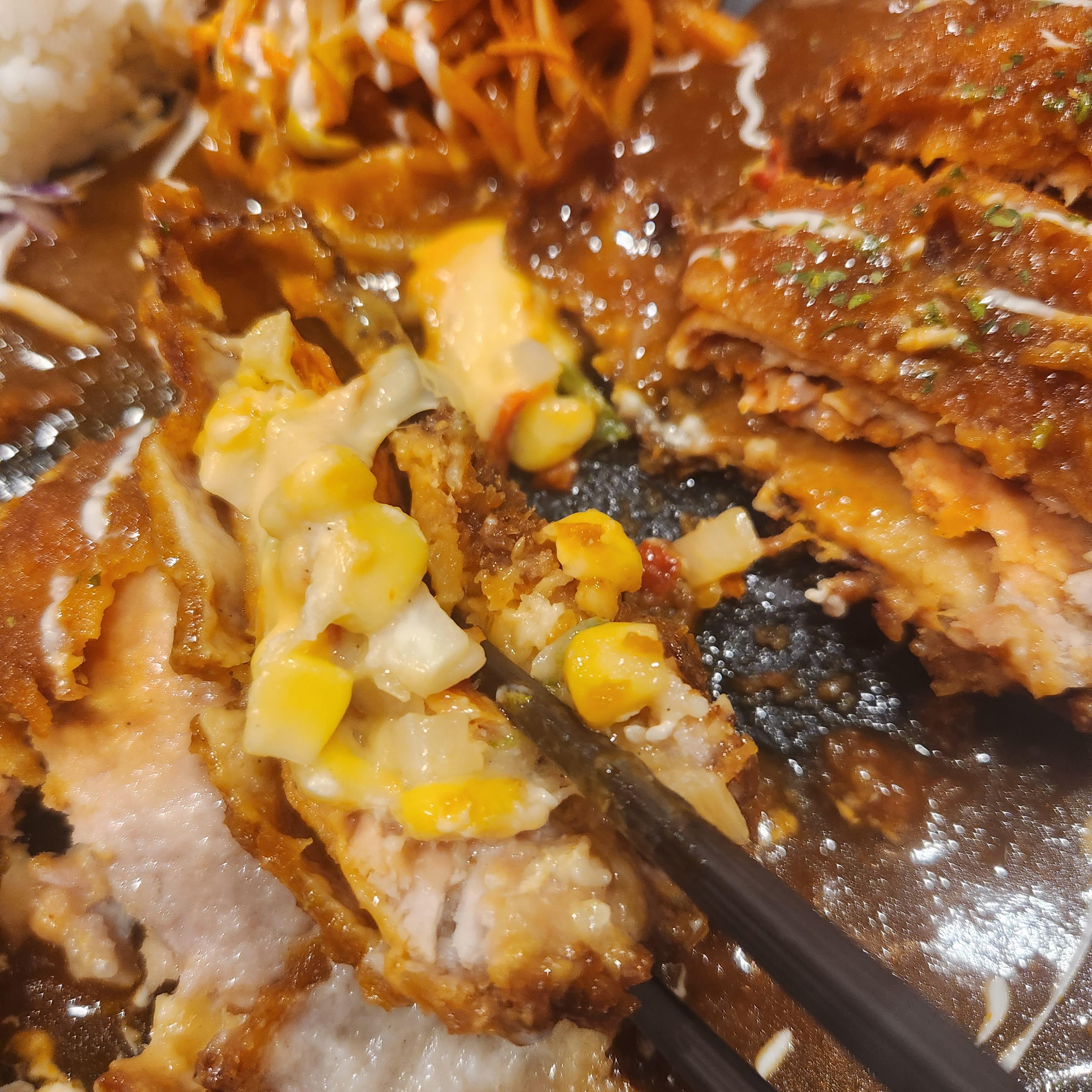 약간 피자돈까스 느낌으로 얇게 썰린 고기 안으로 옥수수, 피망 등의 내용물이 들어가 있습니다!