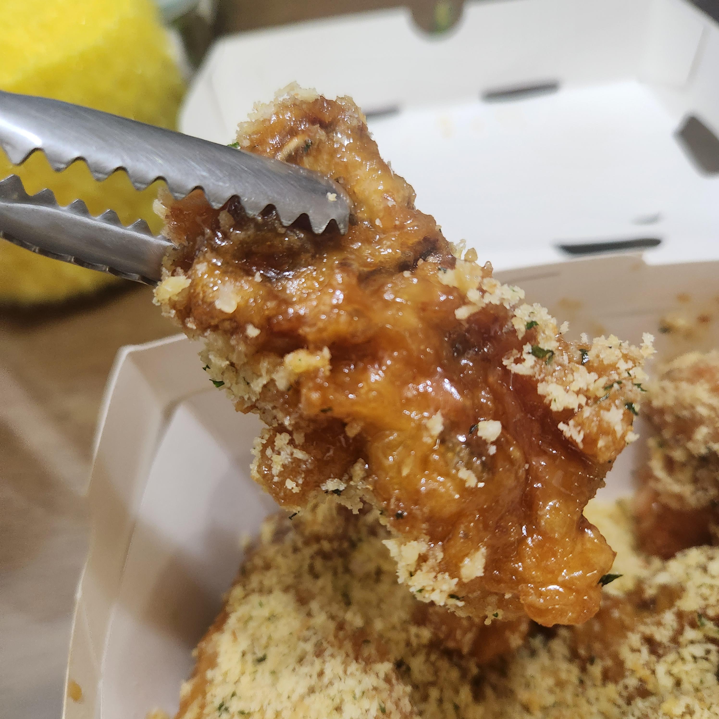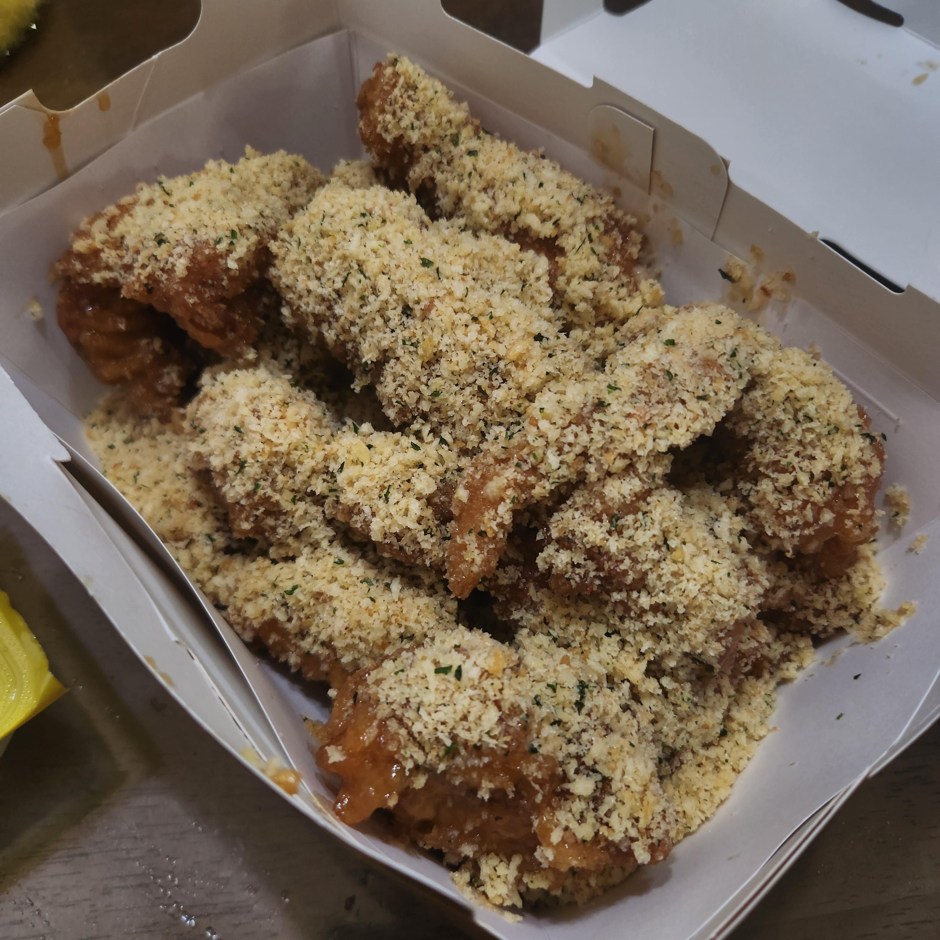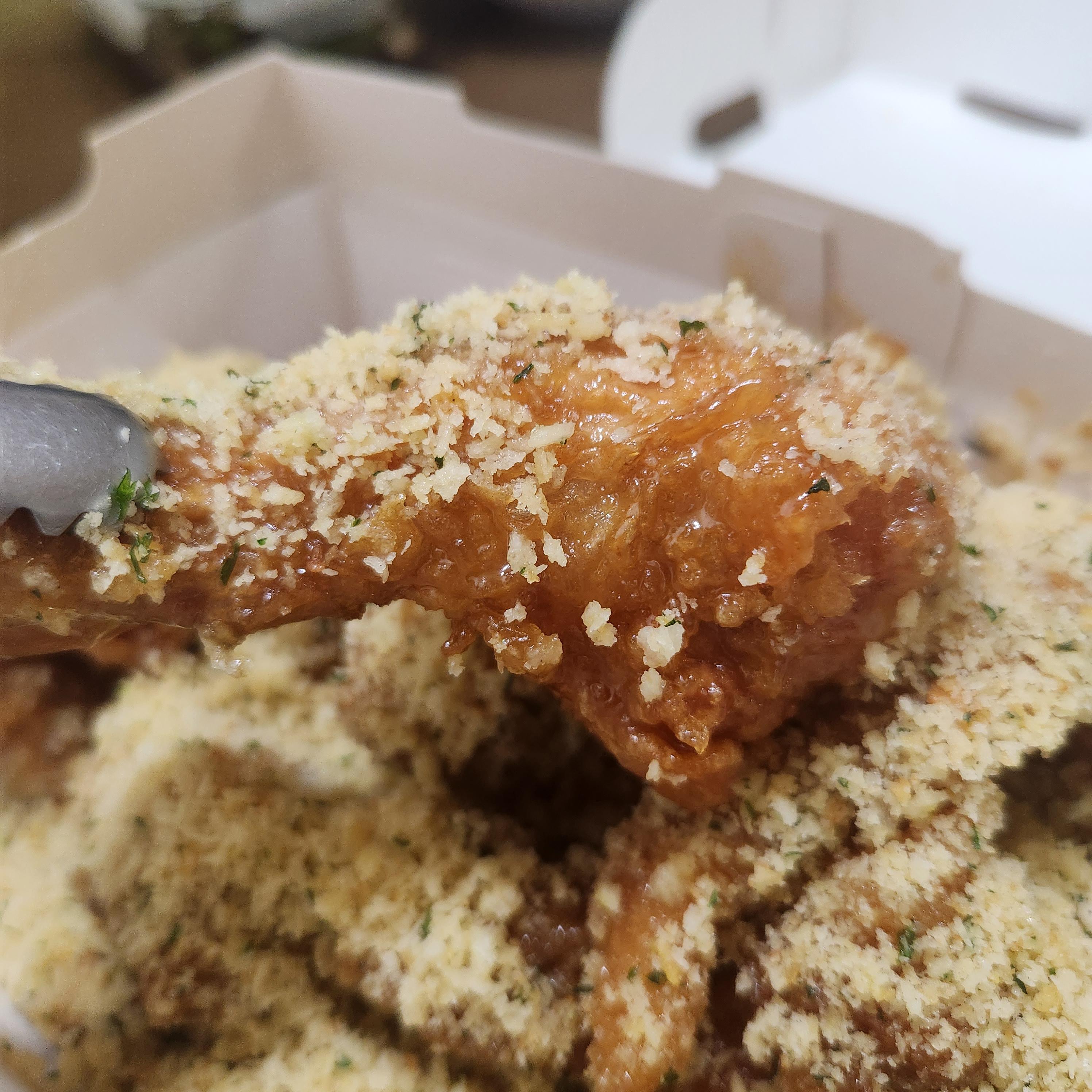 그냥 기본 후라이드에 후레이크가 뿌려진 게 아닌 마늘, 버터소스에 절여진 치킨에 후레이크가 잔뜩 올라가 있습니다.