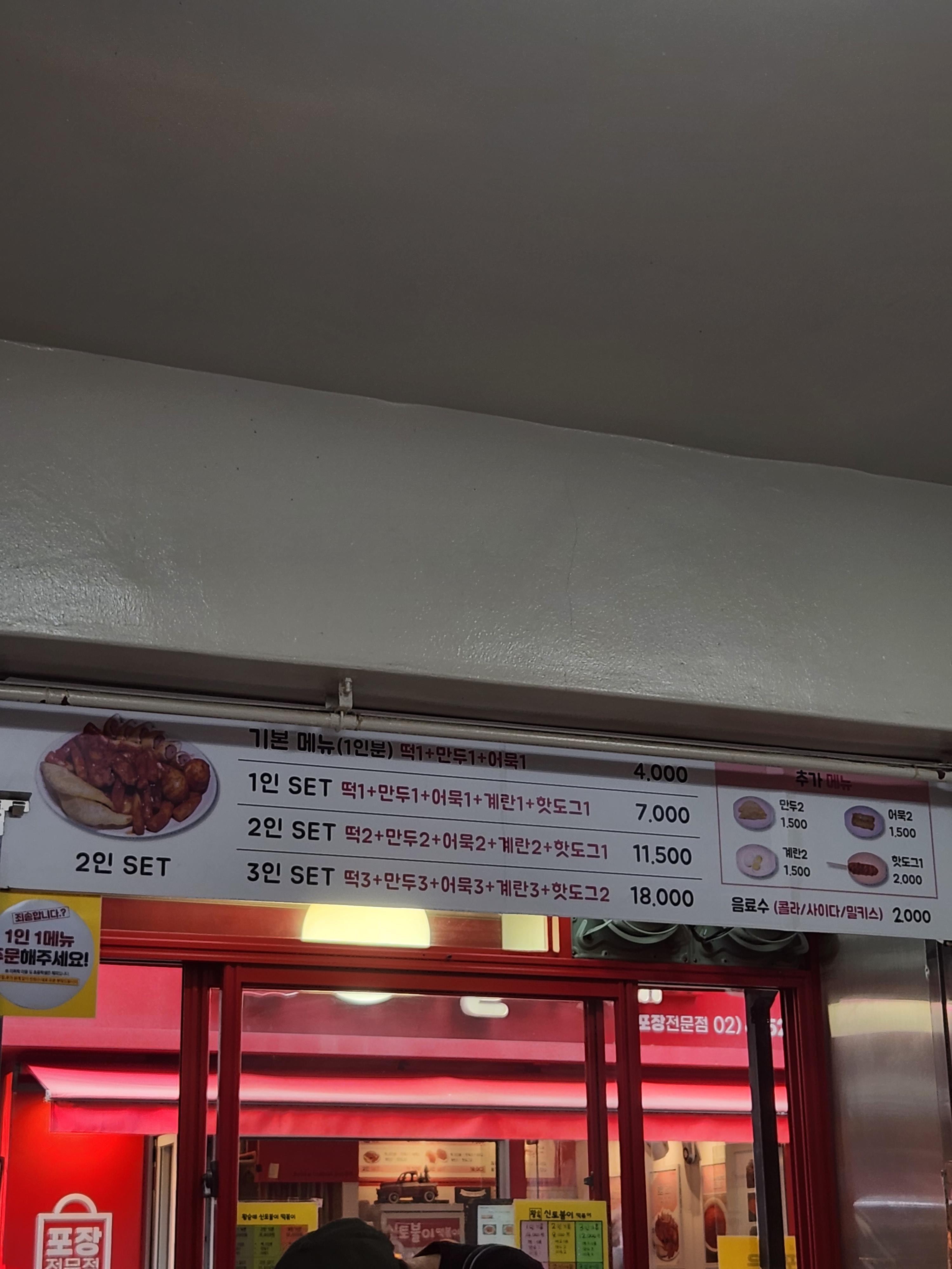 맨 위에 그림자로 인해 잘 안 보이는데요 기본메뉴 1인분 4,000원입니다. 그리고 3인 SET까지 있으며, 혼자서도 많이 오는 가게라 그런지 1인세트 야무지게 판매 중입니다. 여기서 파는 메뉴들은 다 맛볼 수 있는데 7,000원 인 점을 감안해 본다면 정말 혜자인 구성 같네요~ 이 집은 떡볶이 이외에 부가적인 사이드 메뉴를 안 팔더라고요! 떡볶이 맛에 대한 자부심이 워낙 크셔서 그런지 떡볶이에만 올인(?)한 느낌입니다 ~ㅎㅎ