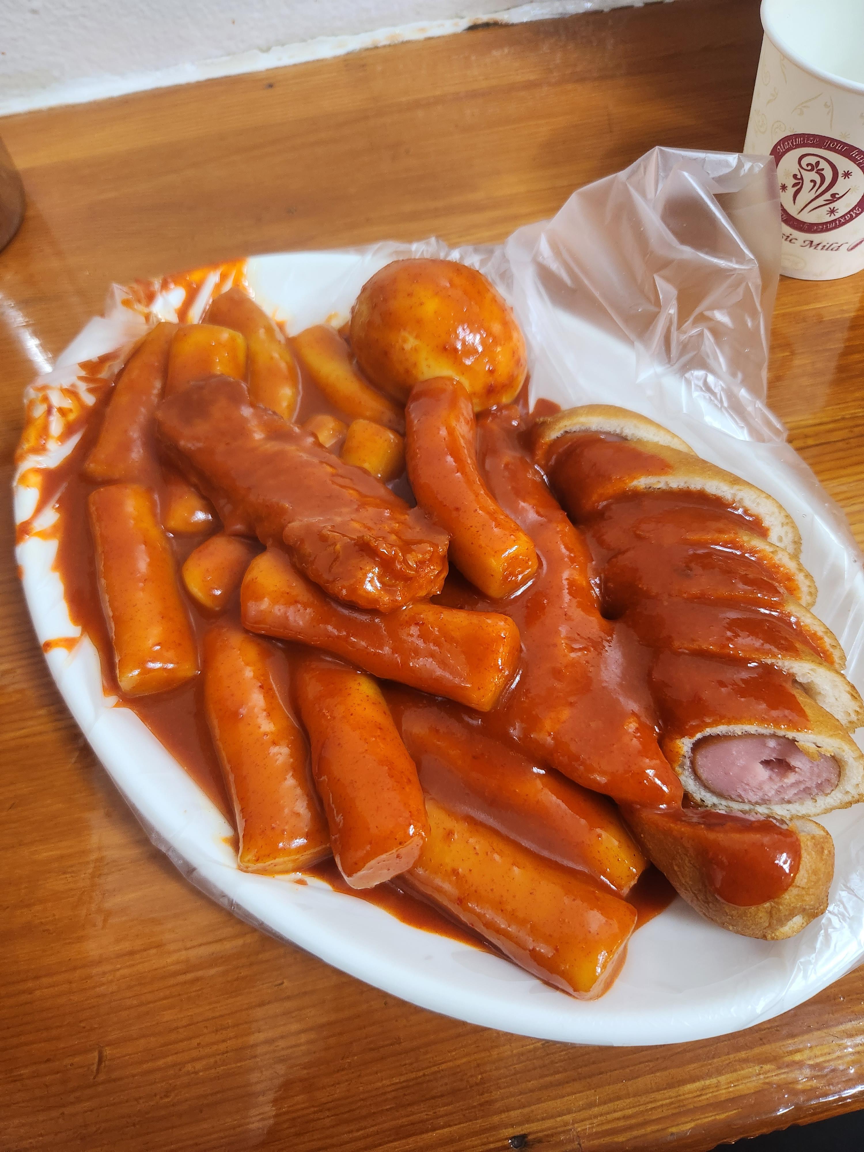 인스타에서 자주 보였던 썰어진 핫도그 위에 떡볶이 소스를 묻혀서 나오는 비주얼! 떡볶이가 잘 졸여졌으며 사진에서 보시다시피 침샘 자극하는 비주얼입니다. 옛날 학교 앞 분식집 느낌으로 젓가락이 아닌 각 테이블마다 작은 포크가 비치되어 있어 포크로 감성 있게 드시면 됩니다~