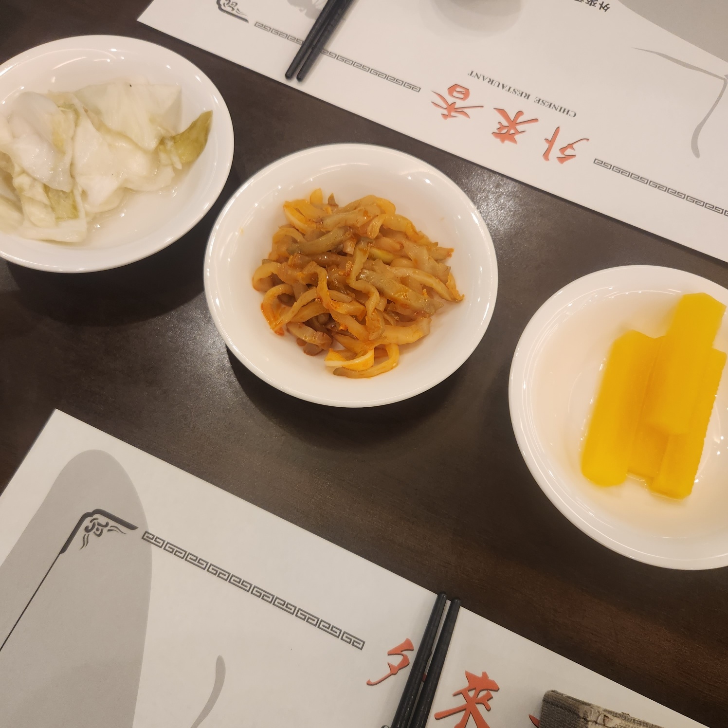자리에 앉으면 각 테이블마다 수저세팅 및 짜사이, 단무지 등의 반찬이 야무지게 세팅되어 있어요.