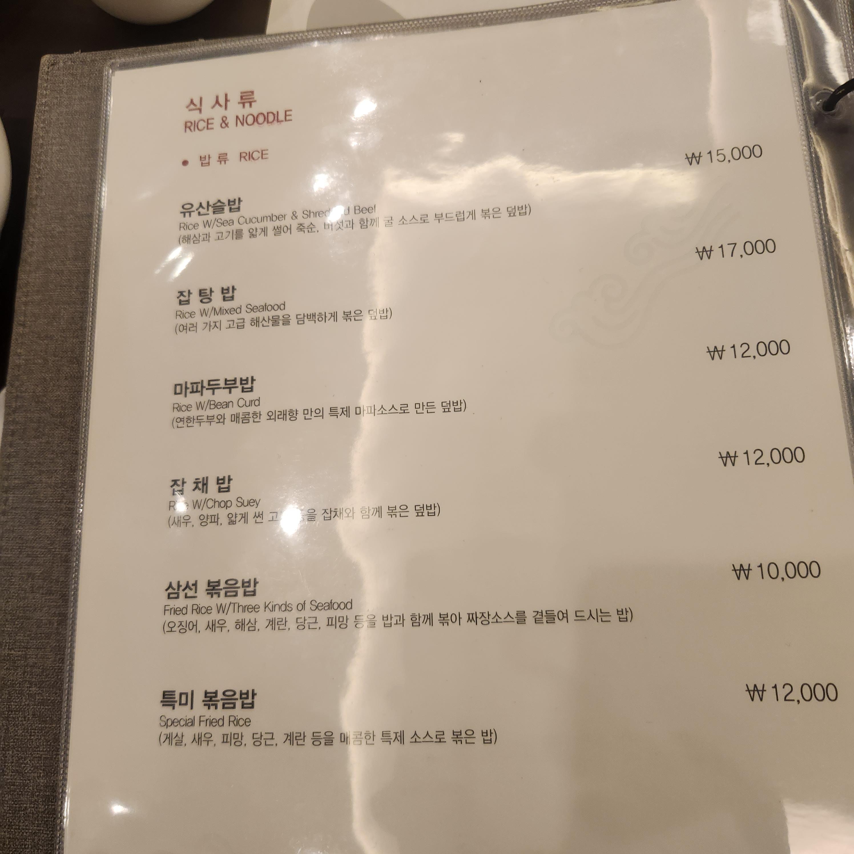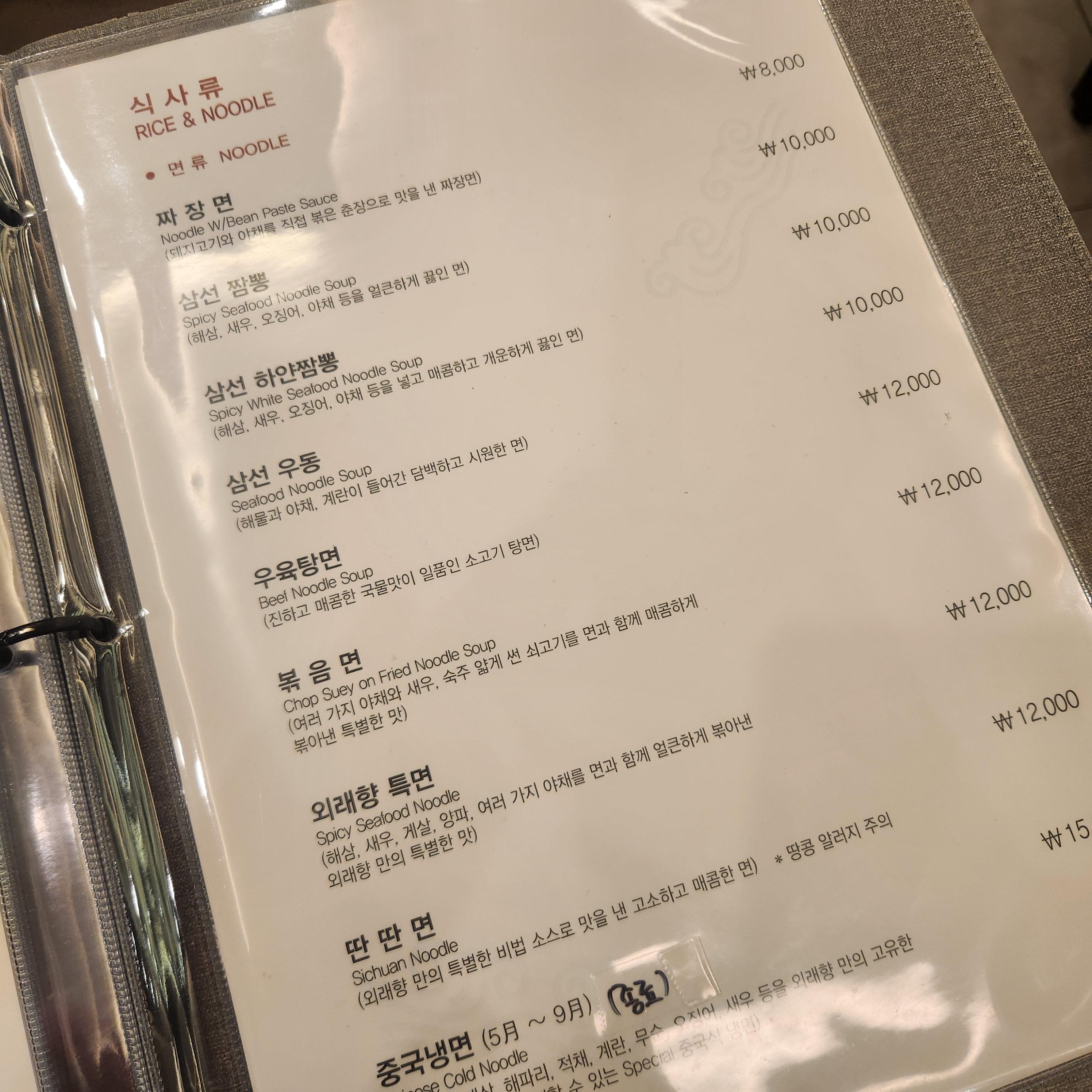 짜장은 8,000원 삼선짬뽕은 10,000원으로 식사류 가격대는 일반 중식당과 별차이 없는 거 같아요.