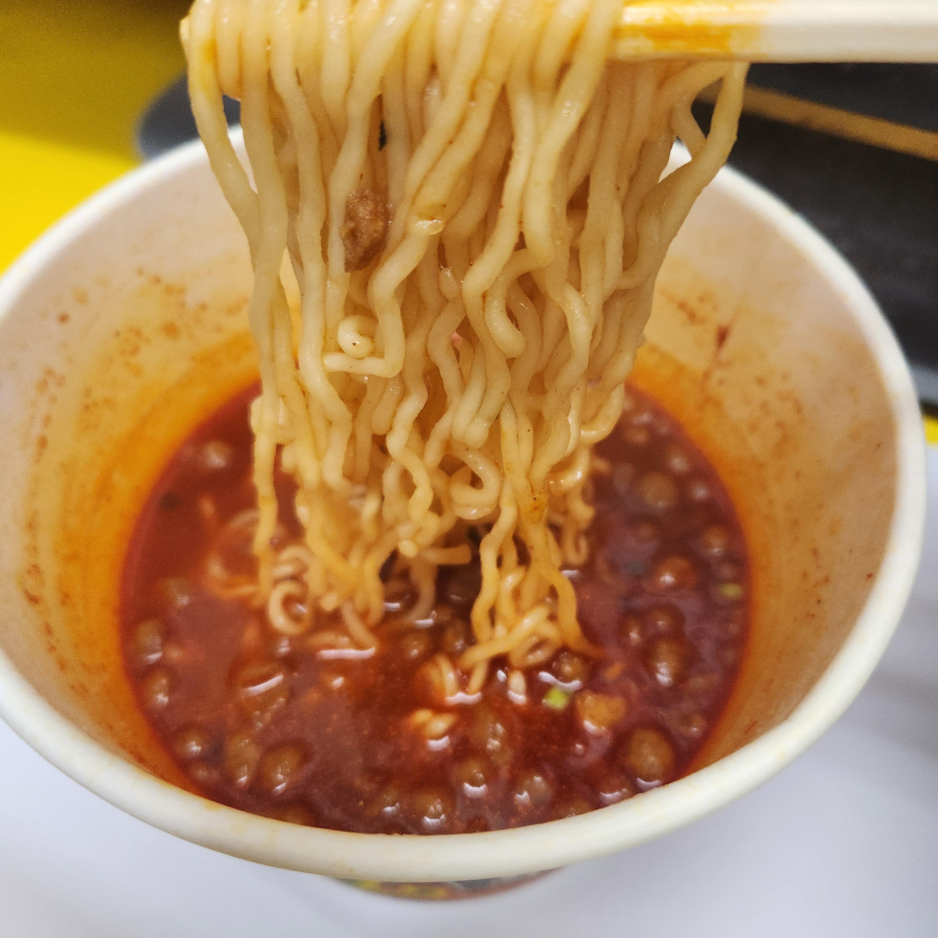 컵 주위에 묻은 고춧가루와 국물 색깔만 봐도 굉장히 얼큰한 맛이 나는 라면 느낌입니다.