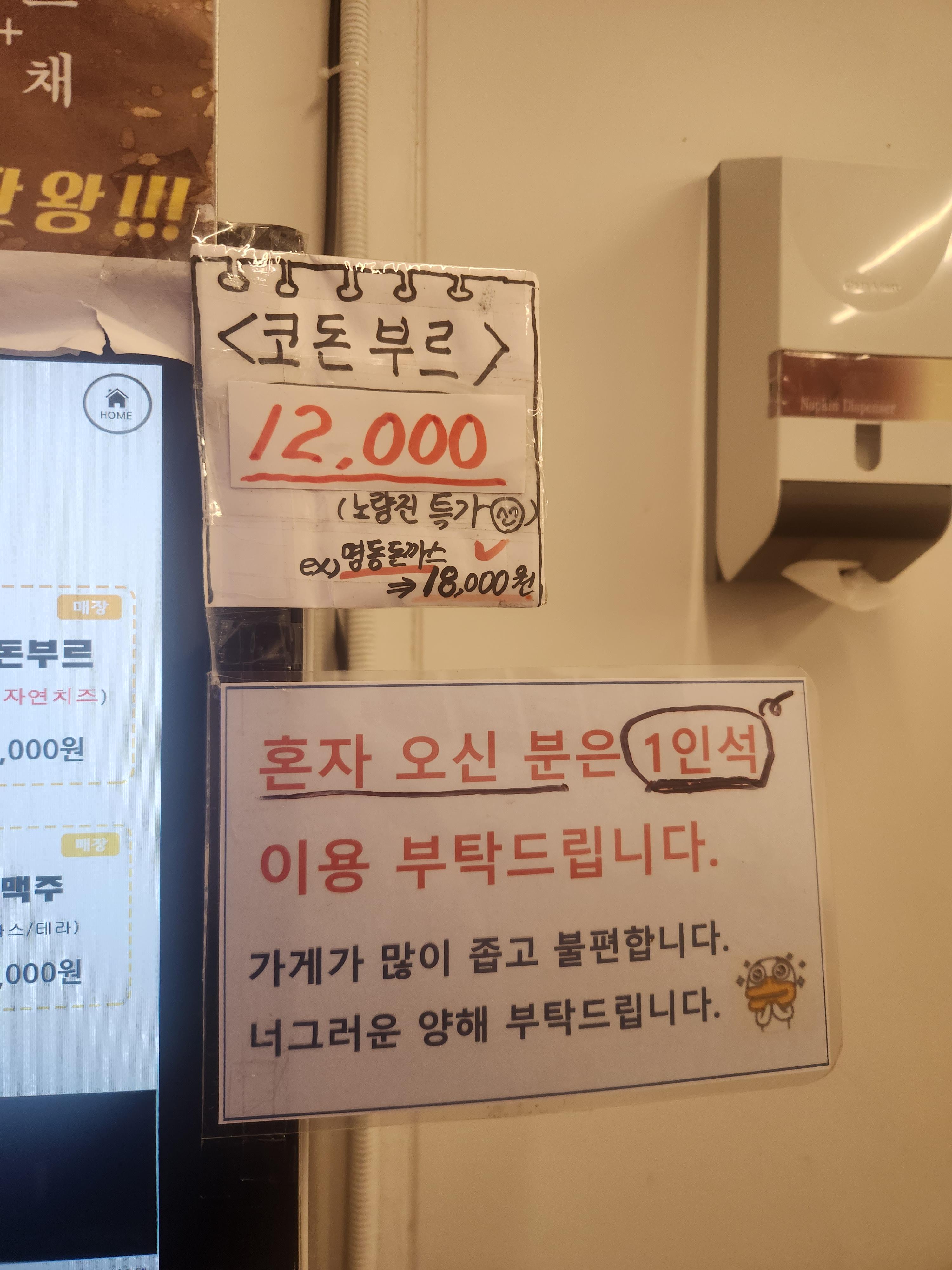 혼자 오실 경우 1인석 이용해 달라는 안내문도 부착되어 있네요~
