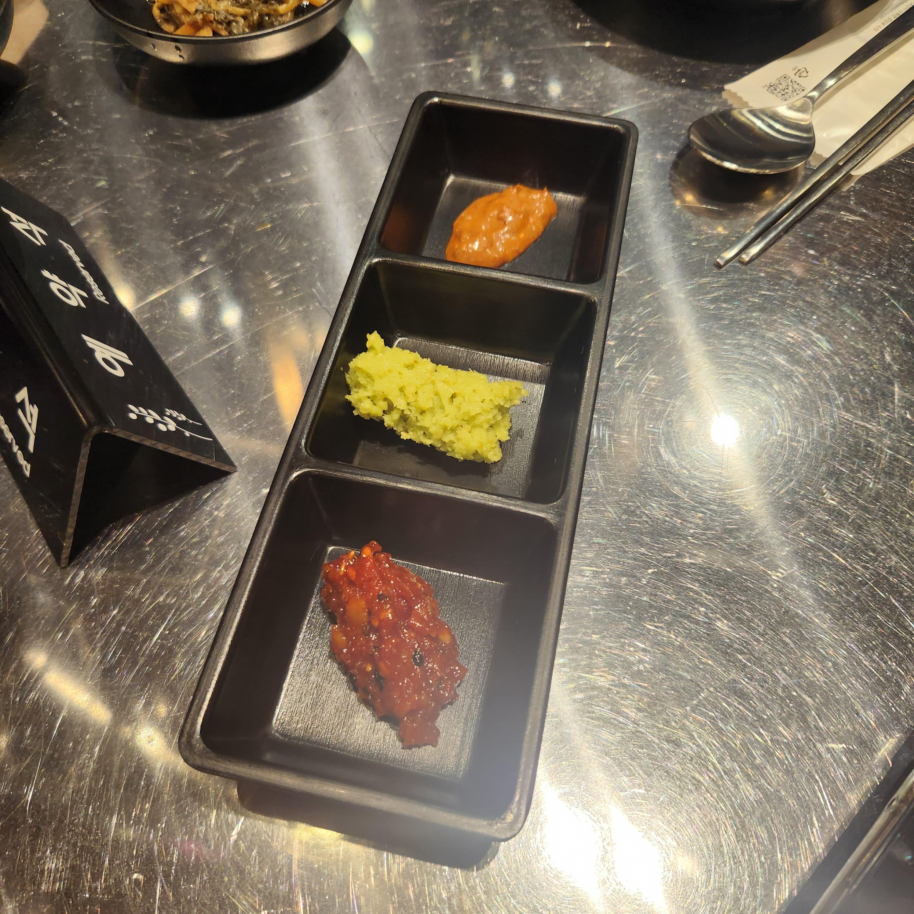 고기의 풍미를 더해 줄 젓갈, 와사비 등 개인 당 기본 세팅이 되며
