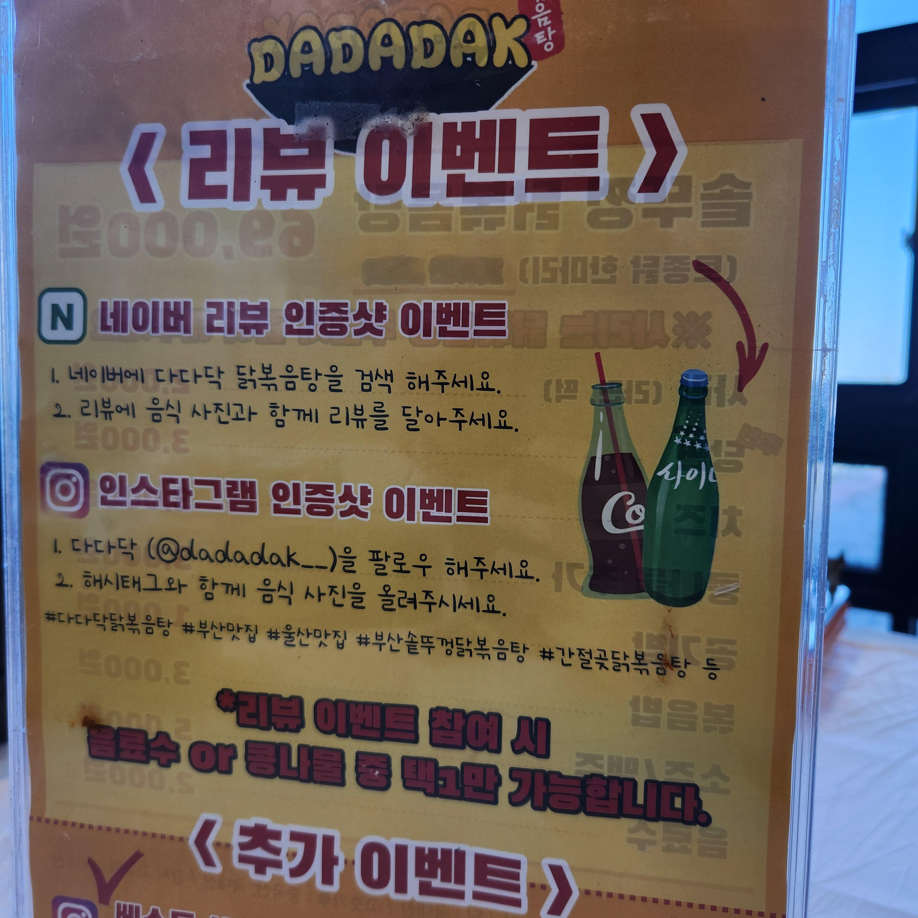다다닥솥뚜껑닭볶음탕 ㅇ 주소 :울산 울주군 서생면 해맞이로 1378 1층 ㅇ 영업시간 : 월~일 10:30 ~ 21:00 (20:00 라스트오더,※화, 수 정기휴무) ㅇ 번호 : 0507-1357-8321