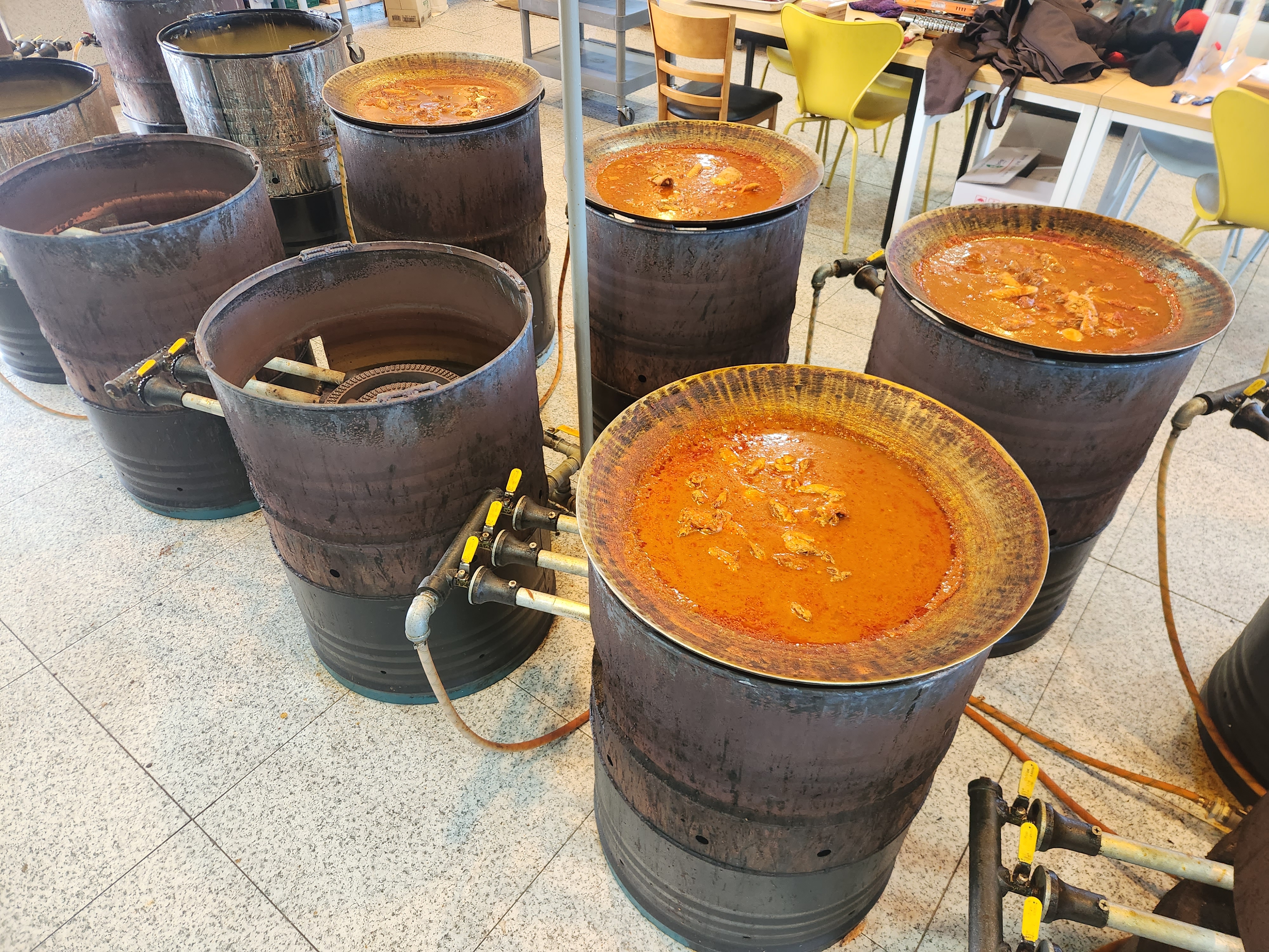 출입문 부근에 솥뚜껑이 10대 설치되어 닭볶음탕 조리를 준비하고 있어요.