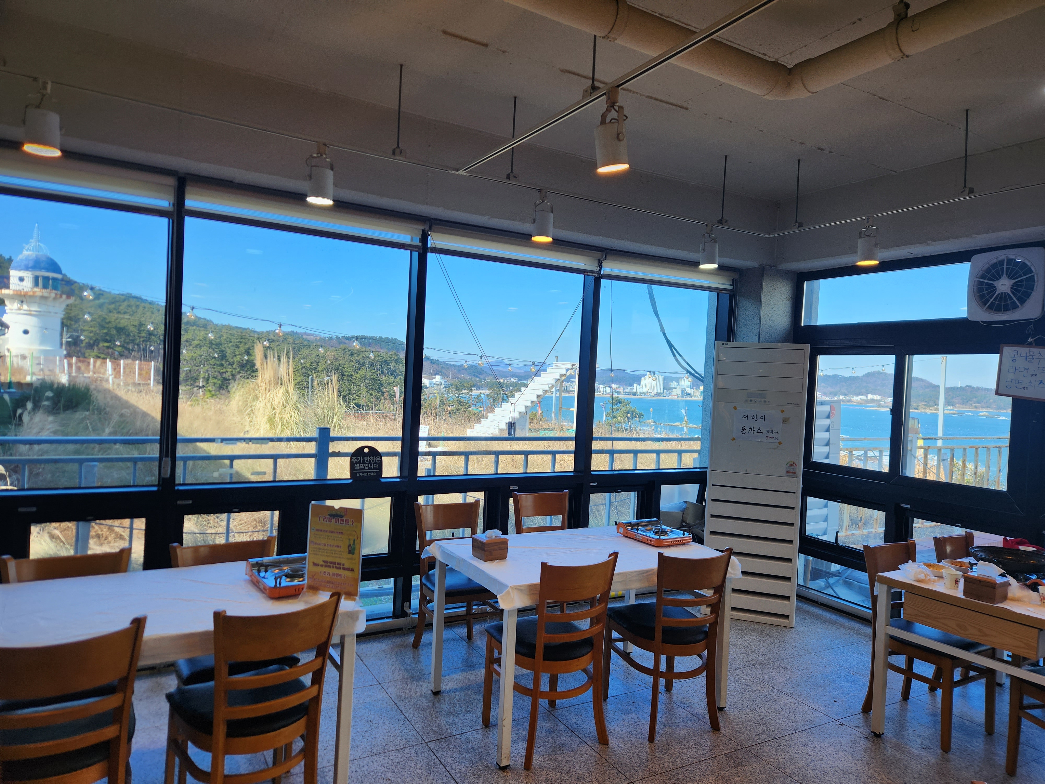 가게 안은 굉장히 넓었으며, 창가 너머로 해안가가 비춰 전망이 너무 좋았어요! 햇살도 들어와 매장이 밝아 분위기도 좋았고요 전반적으로 구조가 맘에 들었습니다~