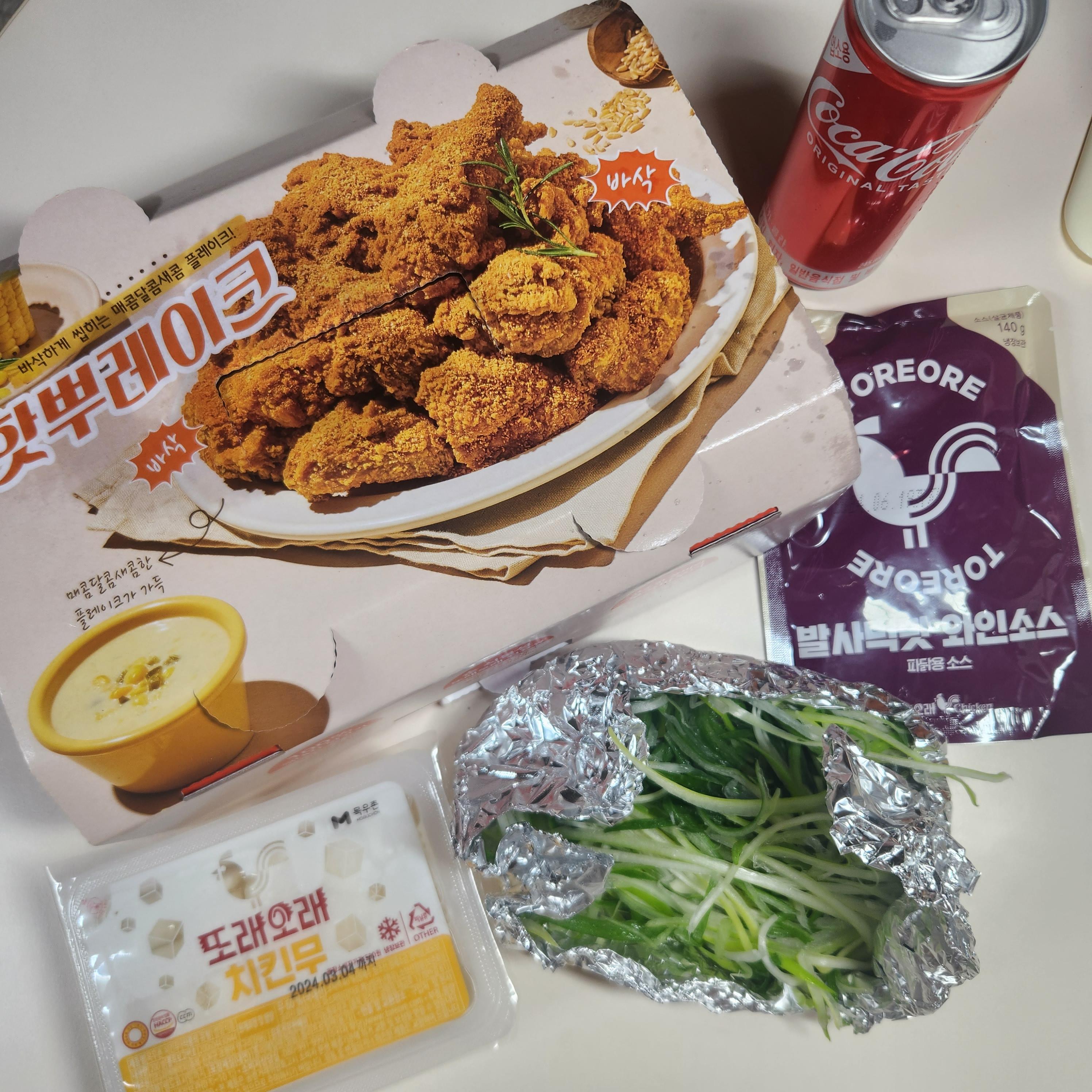 구성으로는 치킨무, 은박지에 쌓인 파채와 파닭 소스, 콜라 250ml 캔 나오네요!