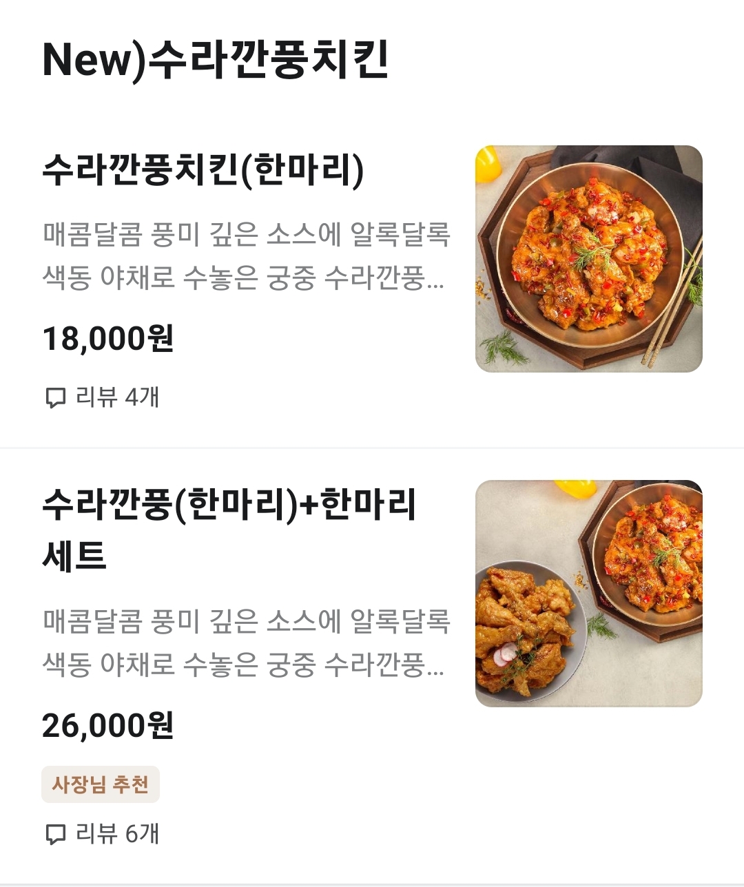 신메뉴 수라깐풍(한 마리) + 한마리 세트가 너무나 좋아 보였습니다.