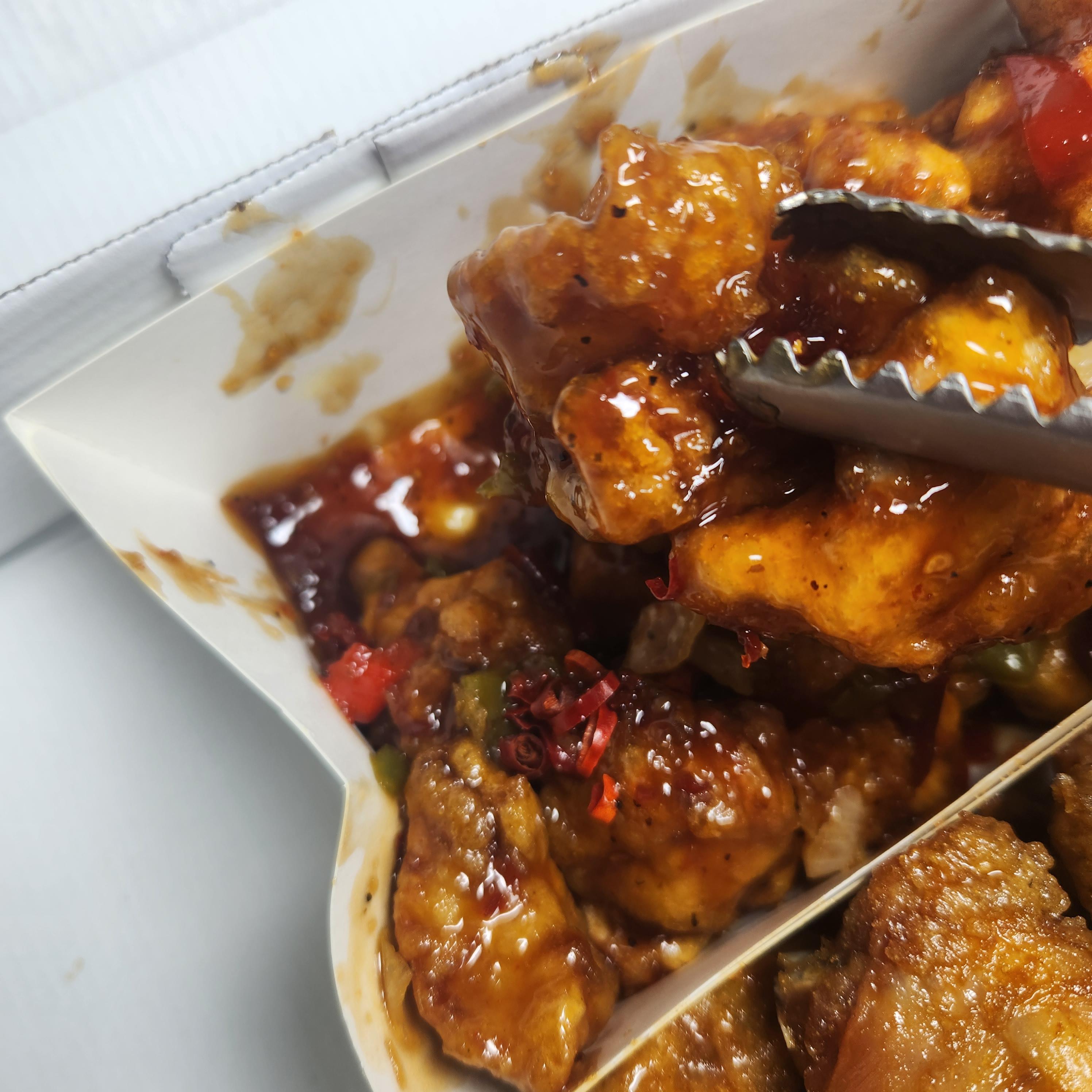 홍고추, 피망, 양파 등을 첨가해 그럴싸한 깐풍 스타일을 구현했습니다.