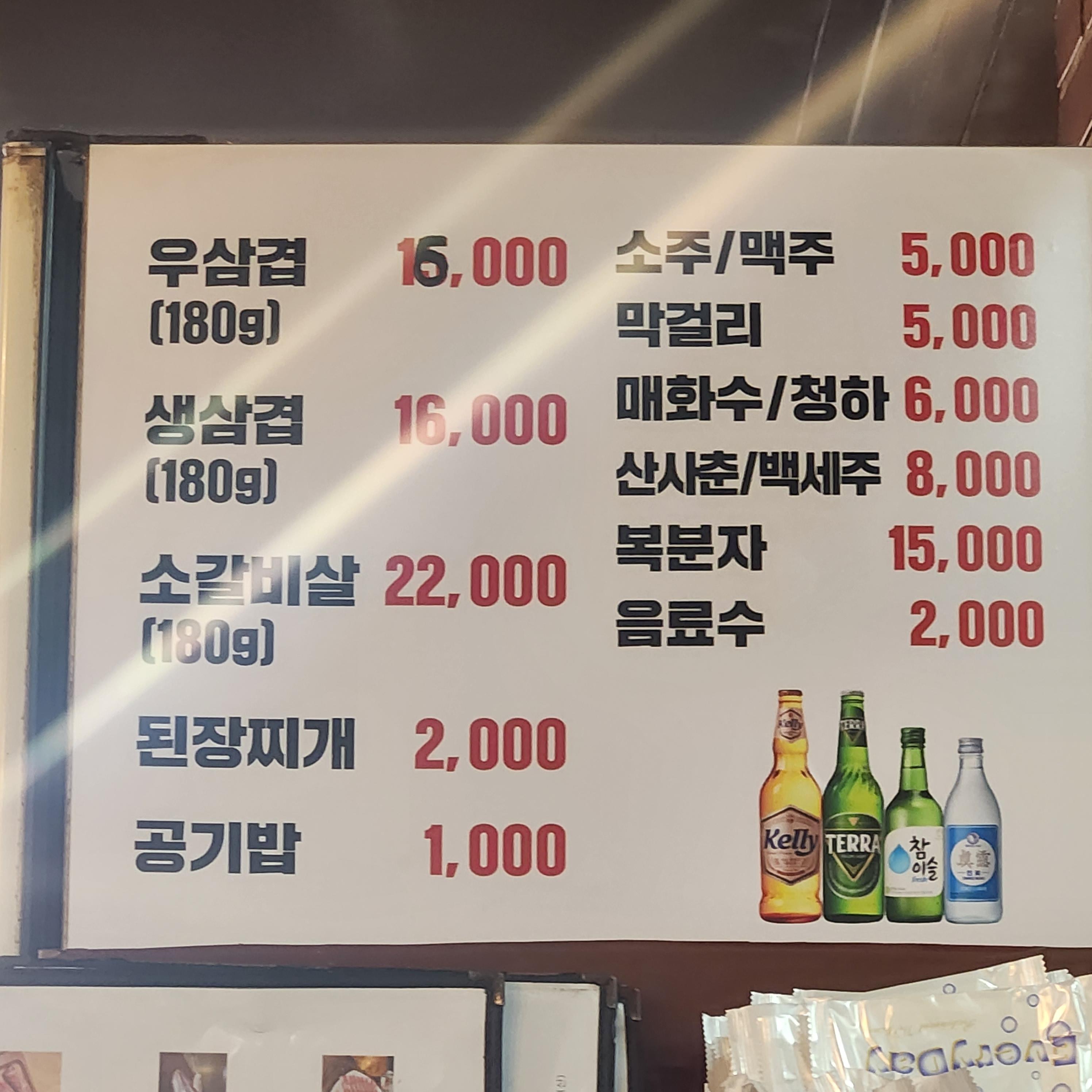 메인메뉴 3가지 우삼겹, 생삼겹, 소갈비살 이렇게 있고요. 식사메뉴는 딱 된장찌개 한 가지입니다!!