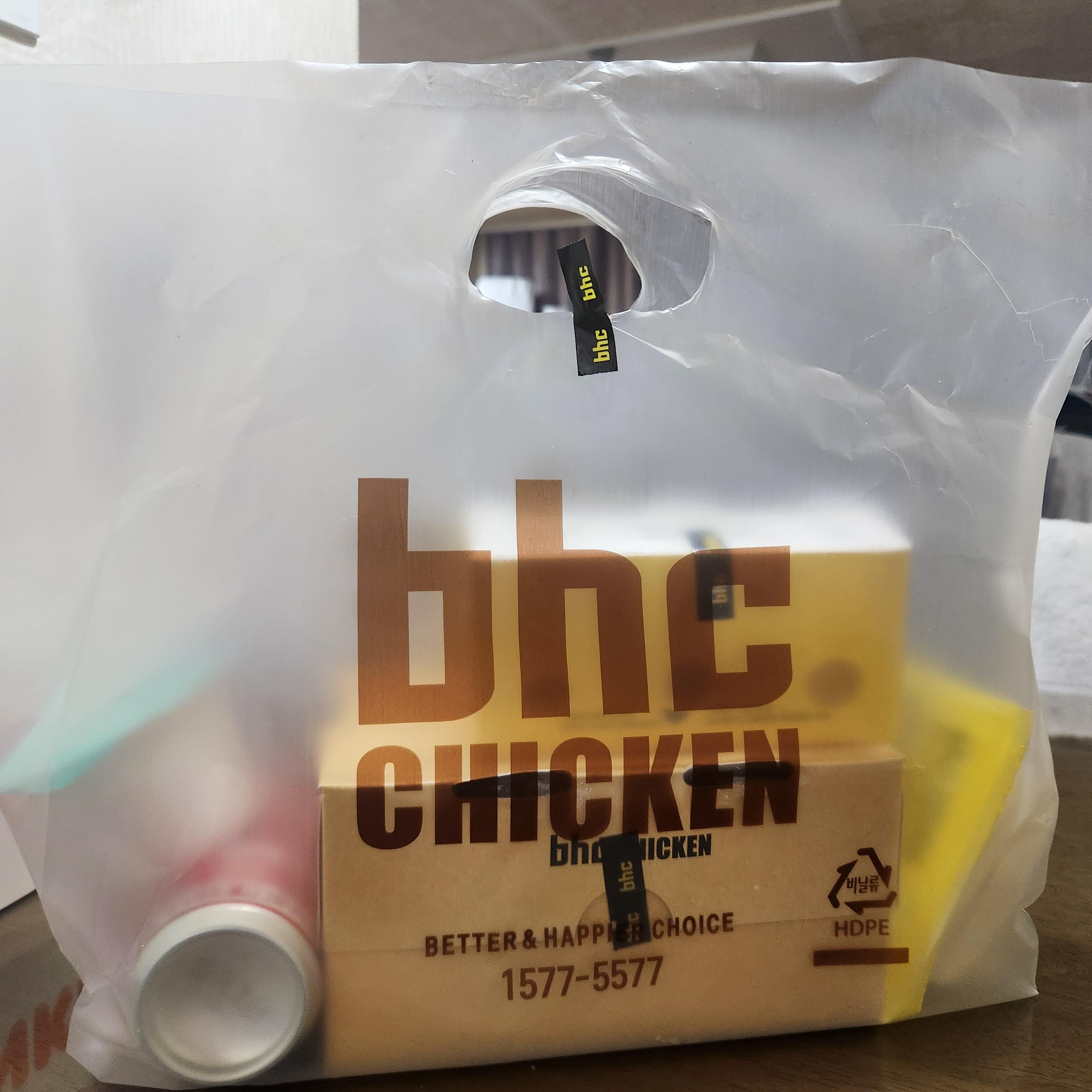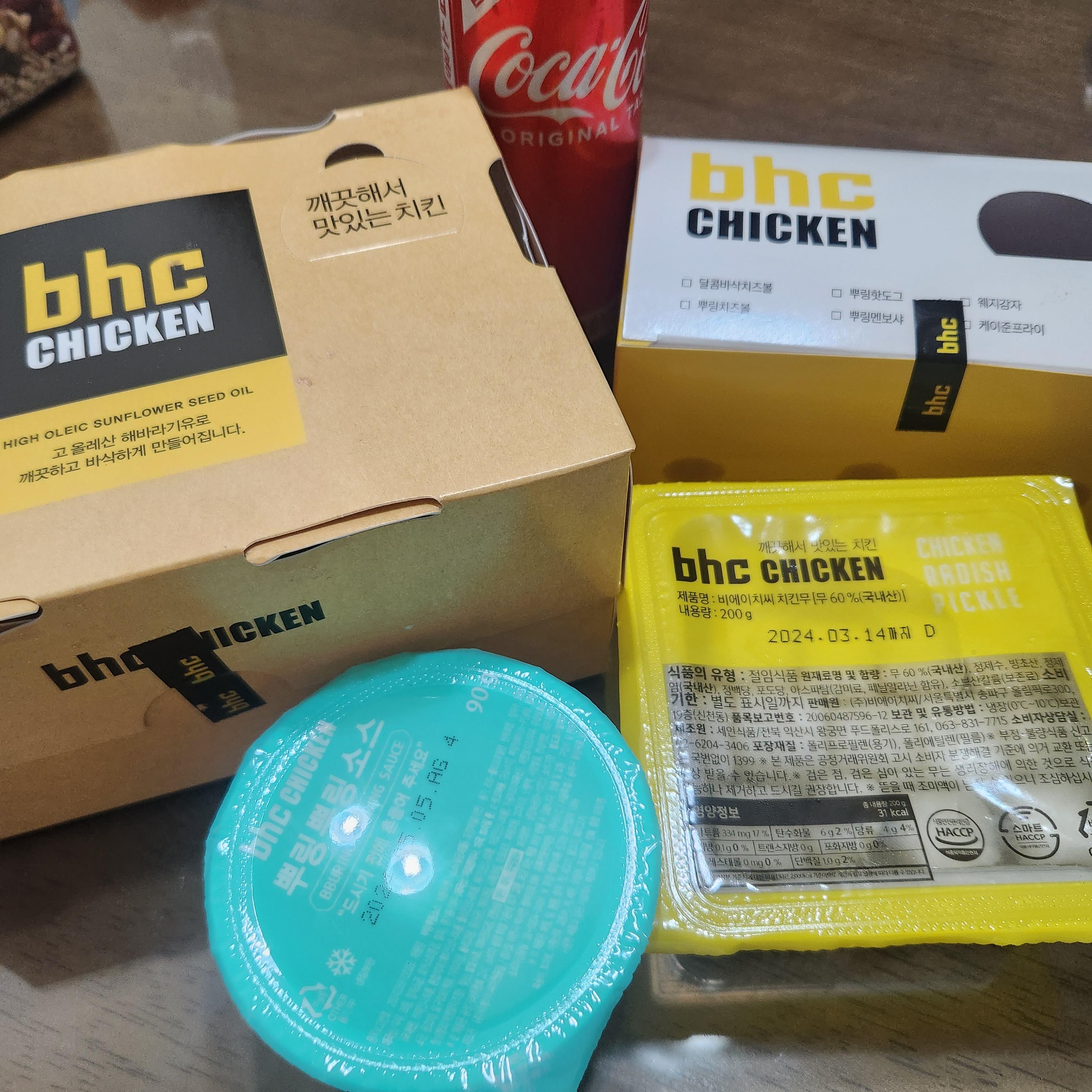 언제나 봐도 정겨운 BHC 포장지에 반마리 용기, 치킨무, 치즈볼, 뿌링소스, 콜라캔으로