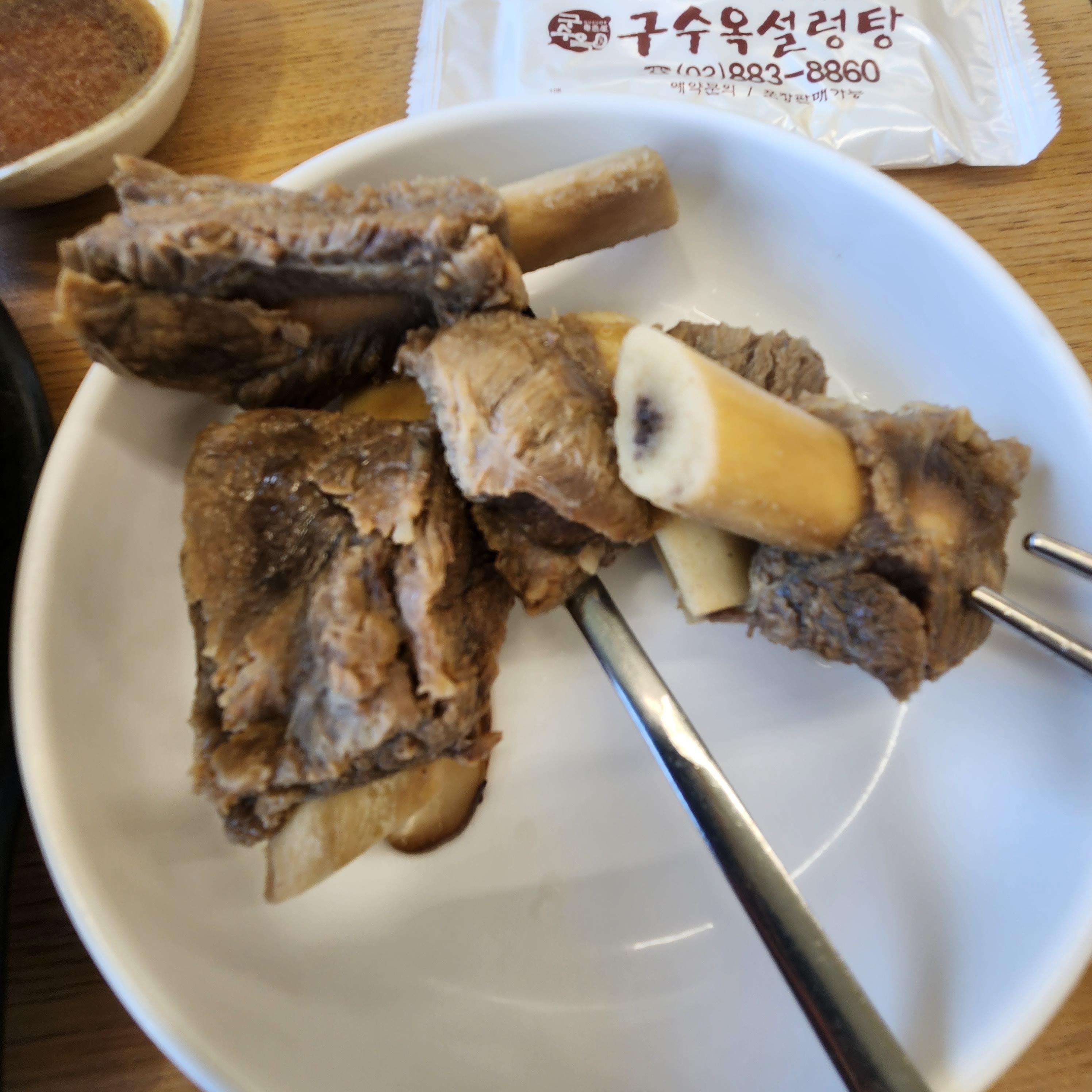 자그마한 갈빗대가 여러 개 들어가 있으며, 국물이 굉장히 깔끔하니 전형적인 맛있는 갈비탕 육수입니다.