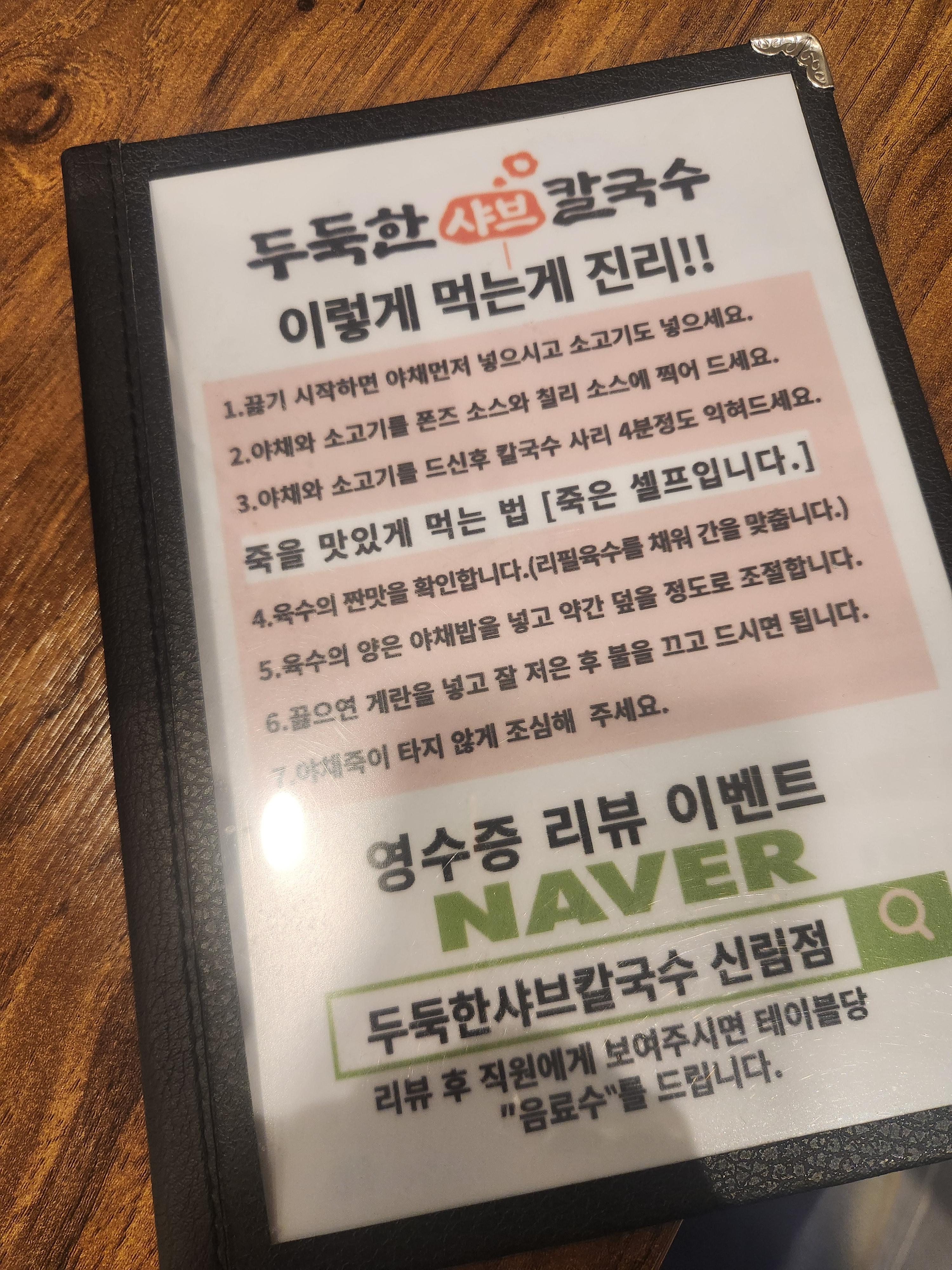 두둑한 샤브칼국수 ㅇ 주소 : 서울 관악구 신림로 64길 17 한서빌딩 1층 ㅇ 영업시간 : 매일 11:00 ~ 22:00 (라스트오더 21:10) ㅇ 번호 : 0507-1313-3949 ㅇ 기타 : https://blog.naver.com/keun8262