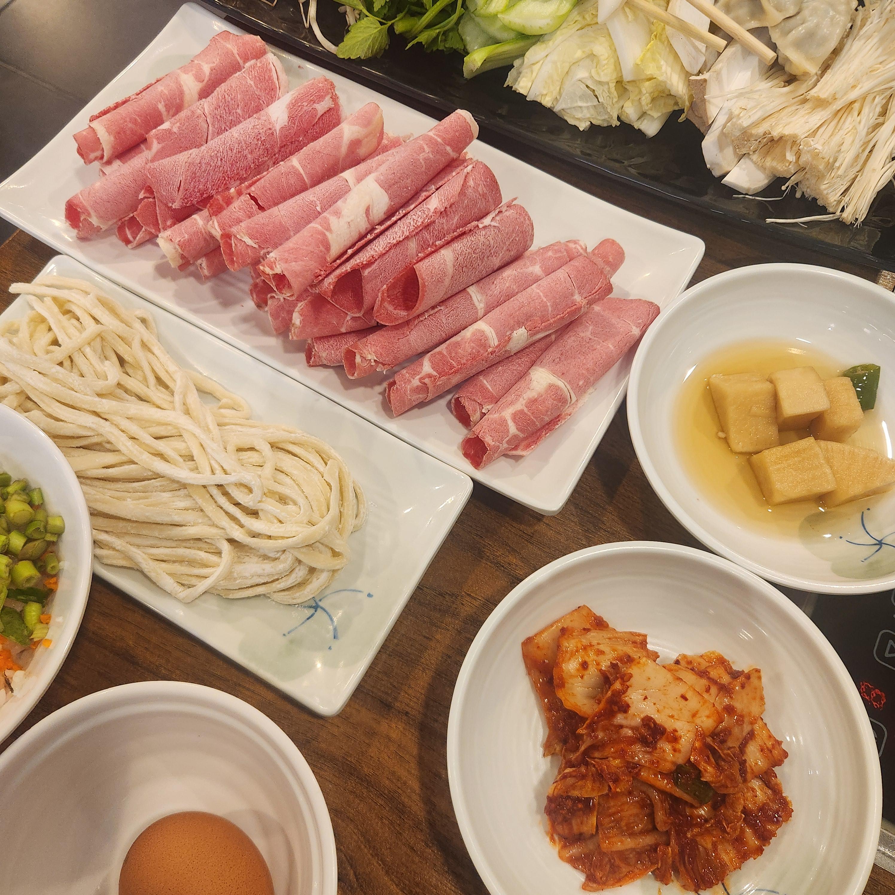 저희가 주문한 샤브 메뉴들이 전부 나옵니다. 칼국수, 볶음밥도 미리 다 세팅해 주시네요!