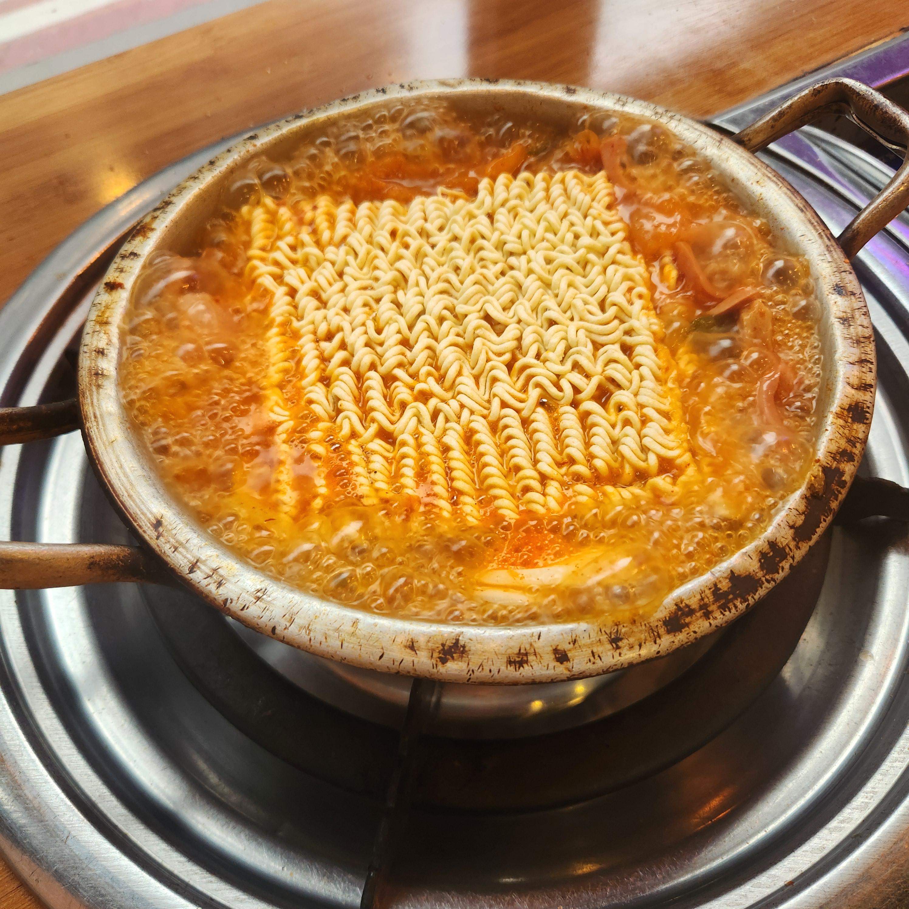 1인 냄비가 끓자마자 라면 사리를 넣어서 허겁지겁 먹었네요.