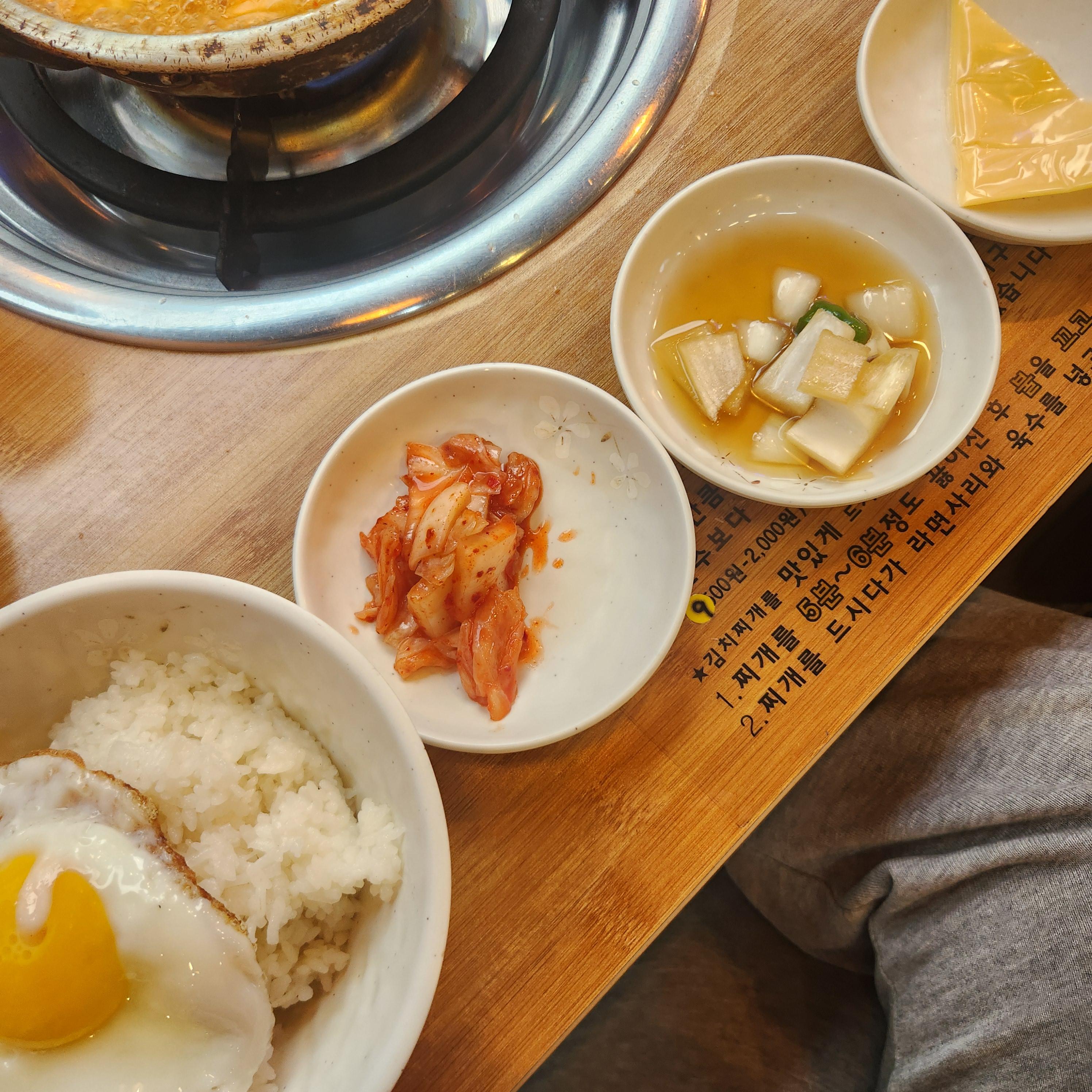 육수가 진하며 묵직한 맛에 김치찌개입니다. 제 입맛에는 조금 짰지만 테이블마다 육수 통이 있어서 넣으시면 됩니다.