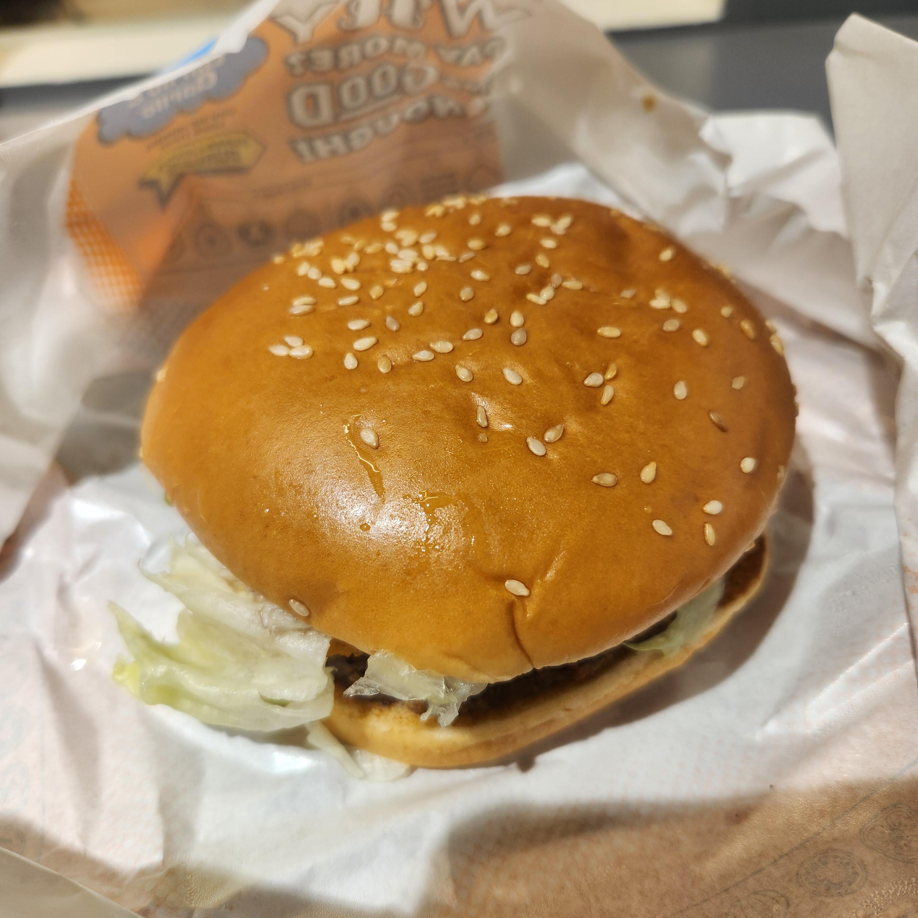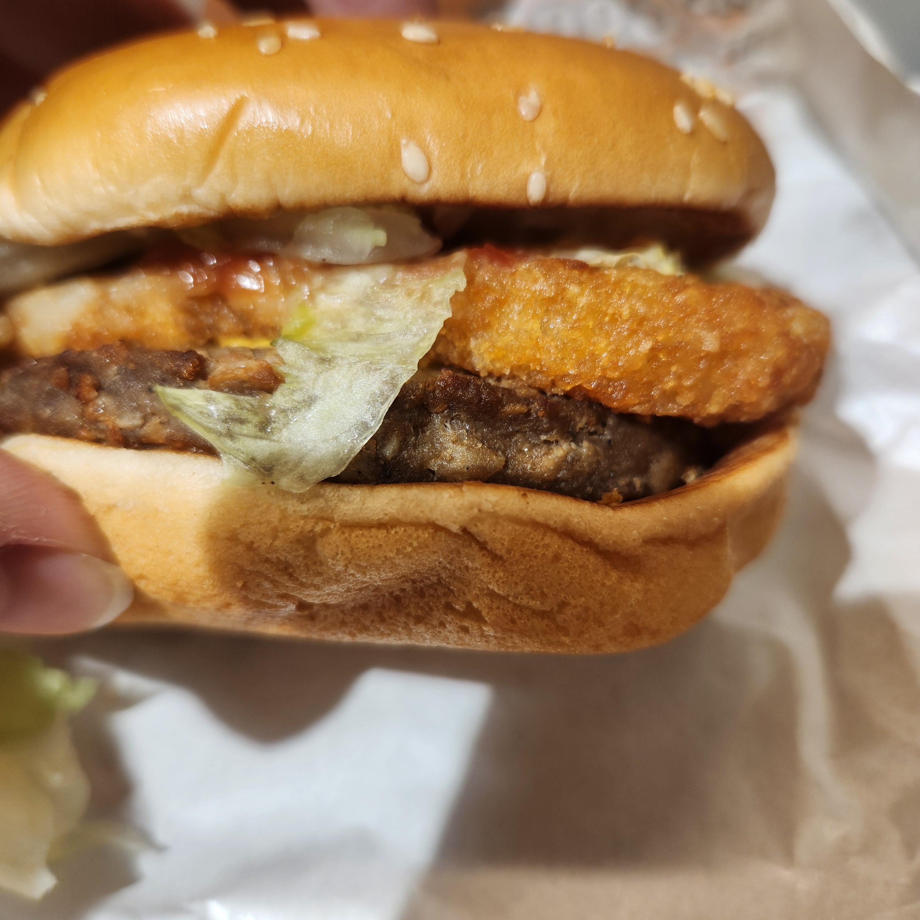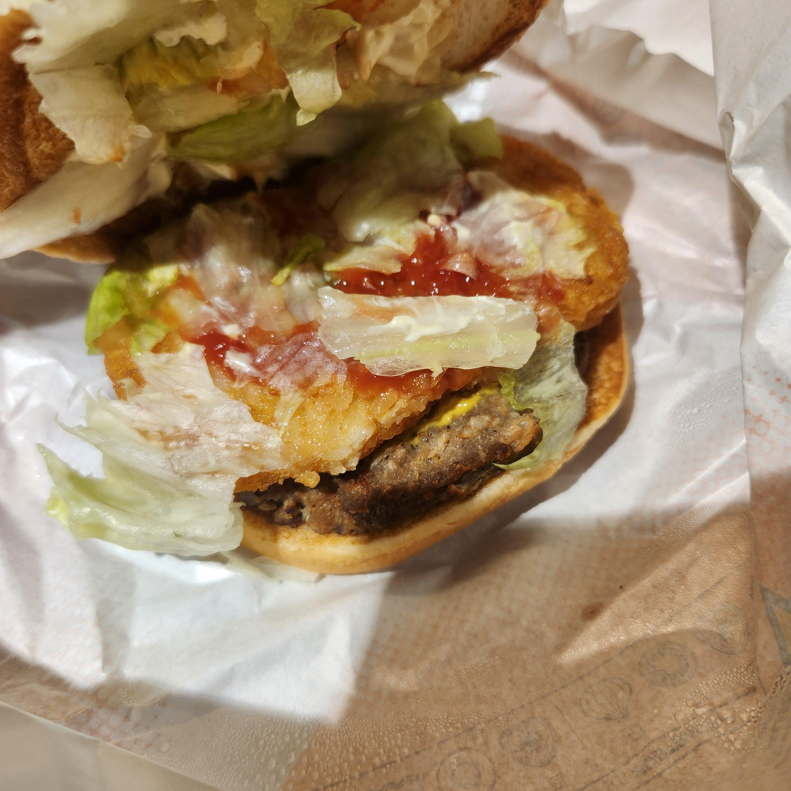 속 재료 구성은 직화 미트 패티에 바삭한 해쉬브라운, 양상추가 들어가 있으며