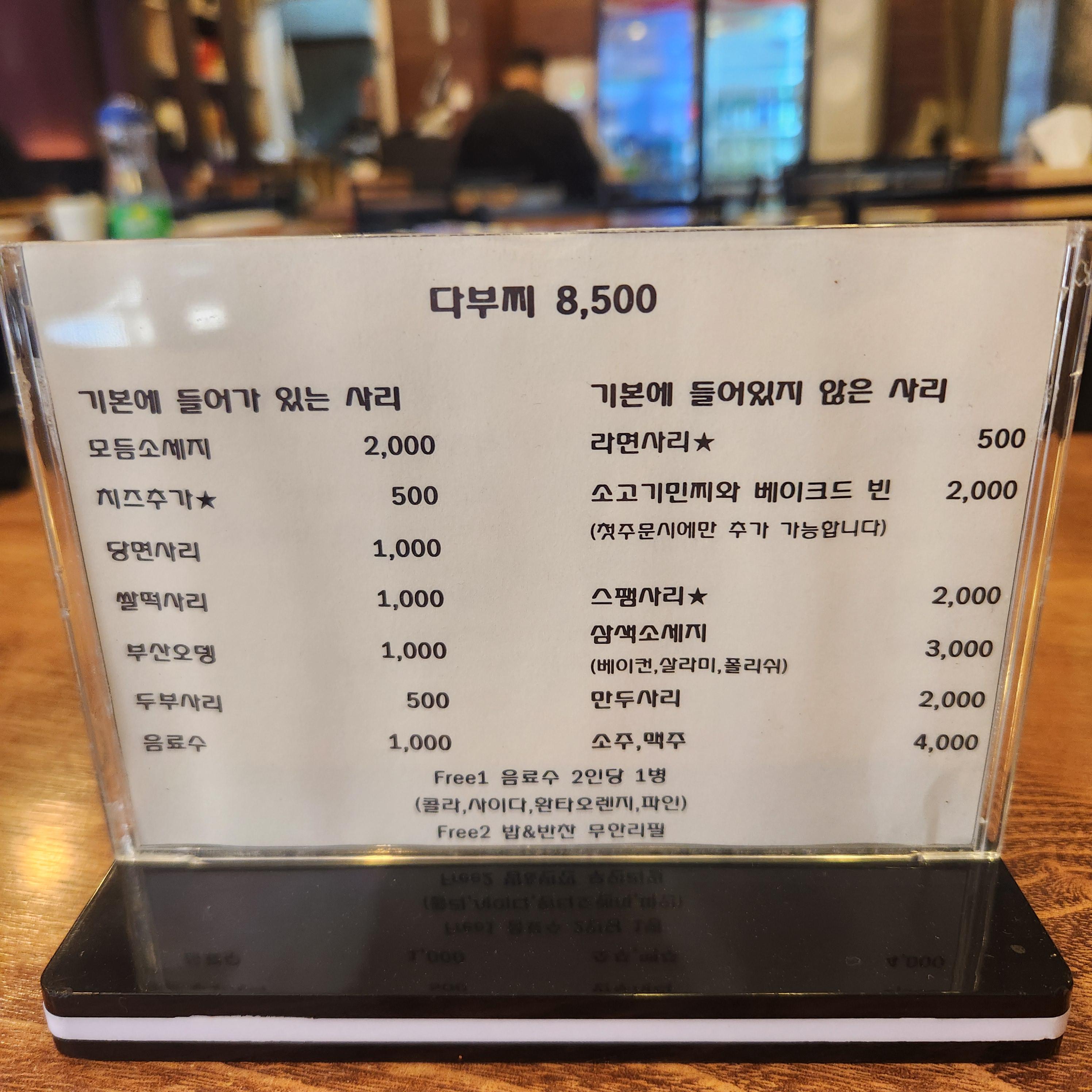 기본 부대찌개 1인 분은 8,500원 라면사리는 500원으로 가격대가 매우 저렴하고 각 종 사리등도