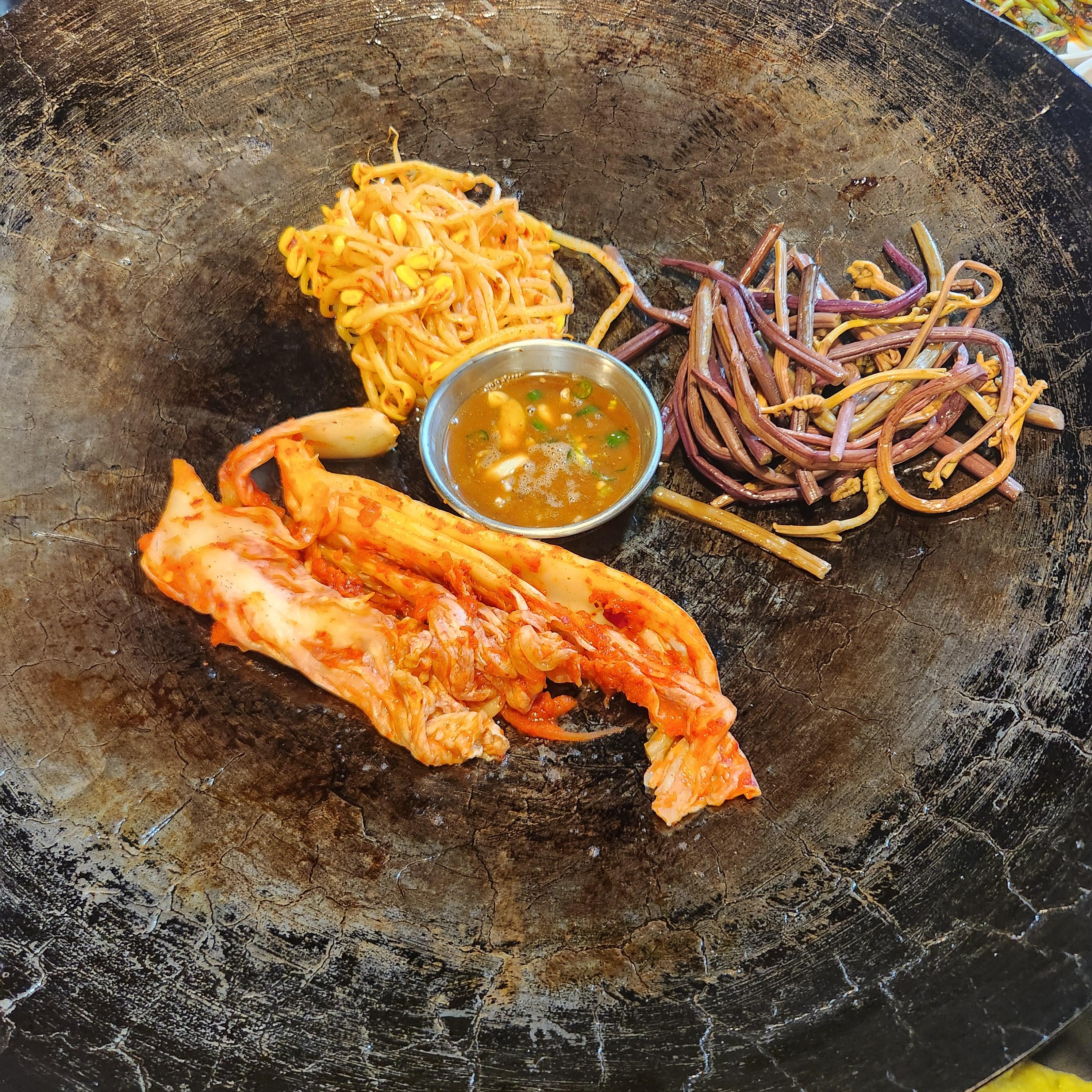 대형 가마솥에 콩나물, 고사리, 김치, 찍어먹는 굴젓을 올려줍니다.