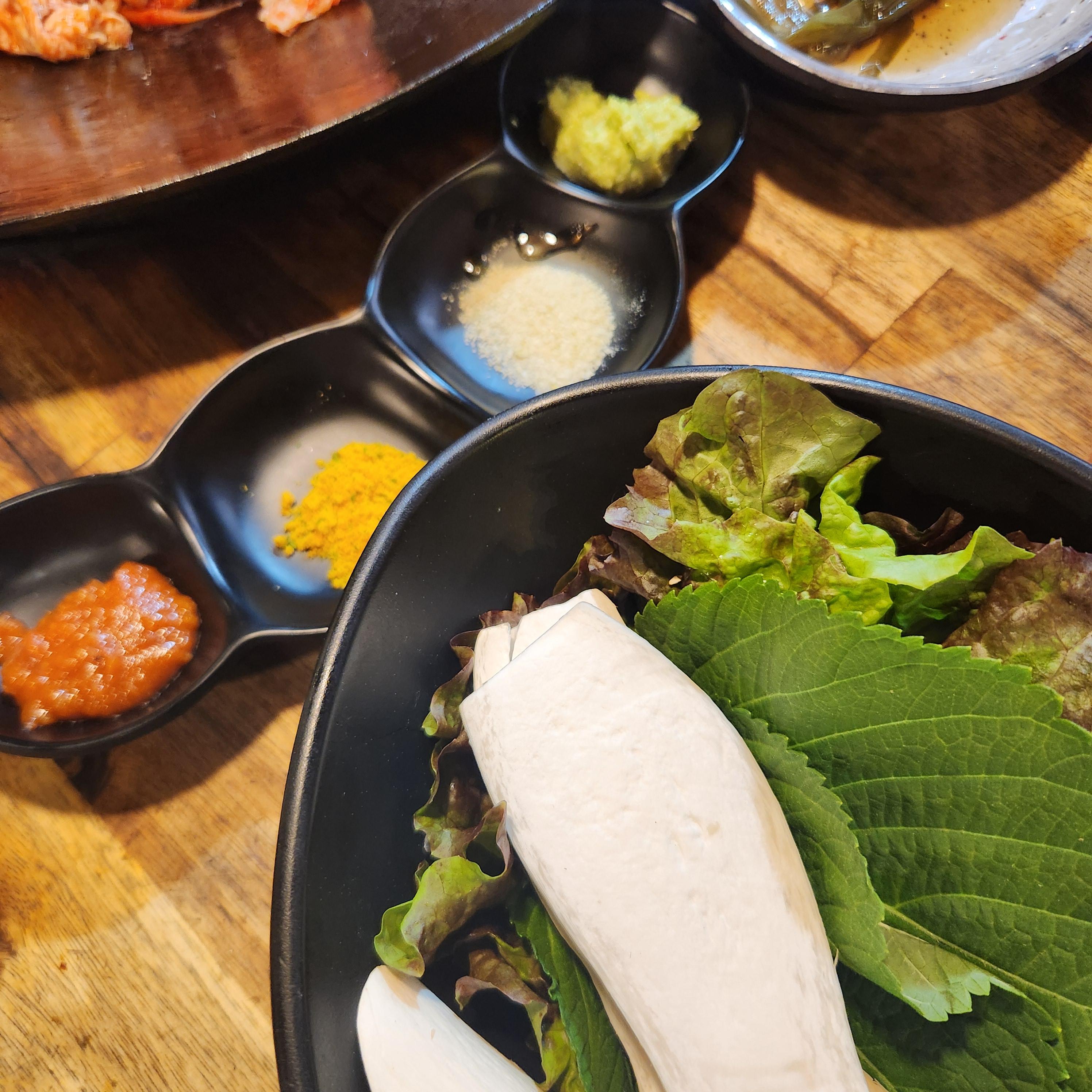 맛보기 쫄면, 명이나물, 줄기, 젓갈 등 밑반찬이 나오며 쌈 채소와 쌈장, 카레, 고추냉이 등의 다양한 소스도 나옵니다.