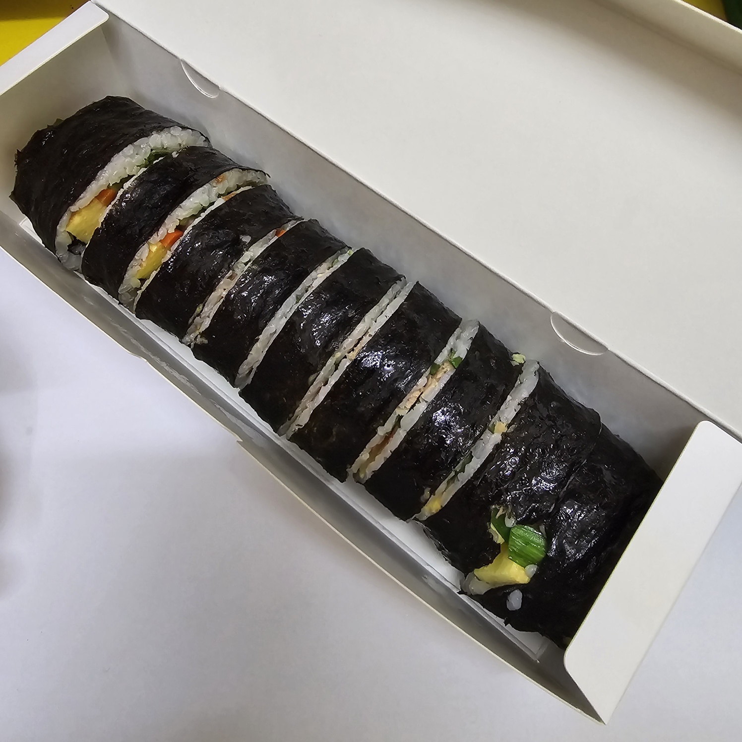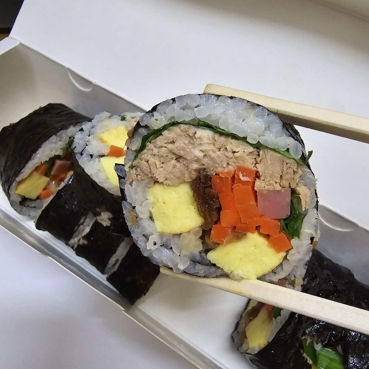 김밥은 은박지, 종이에 감싸오는 게 아닌 종이 곽 용기에 야무지게 담겨옵니다.