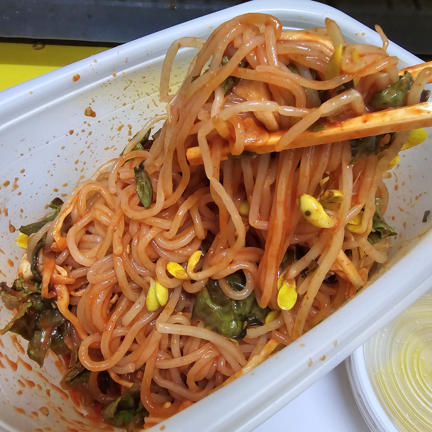 쫄면은 플라스틱 용기에 담겨옵니다.