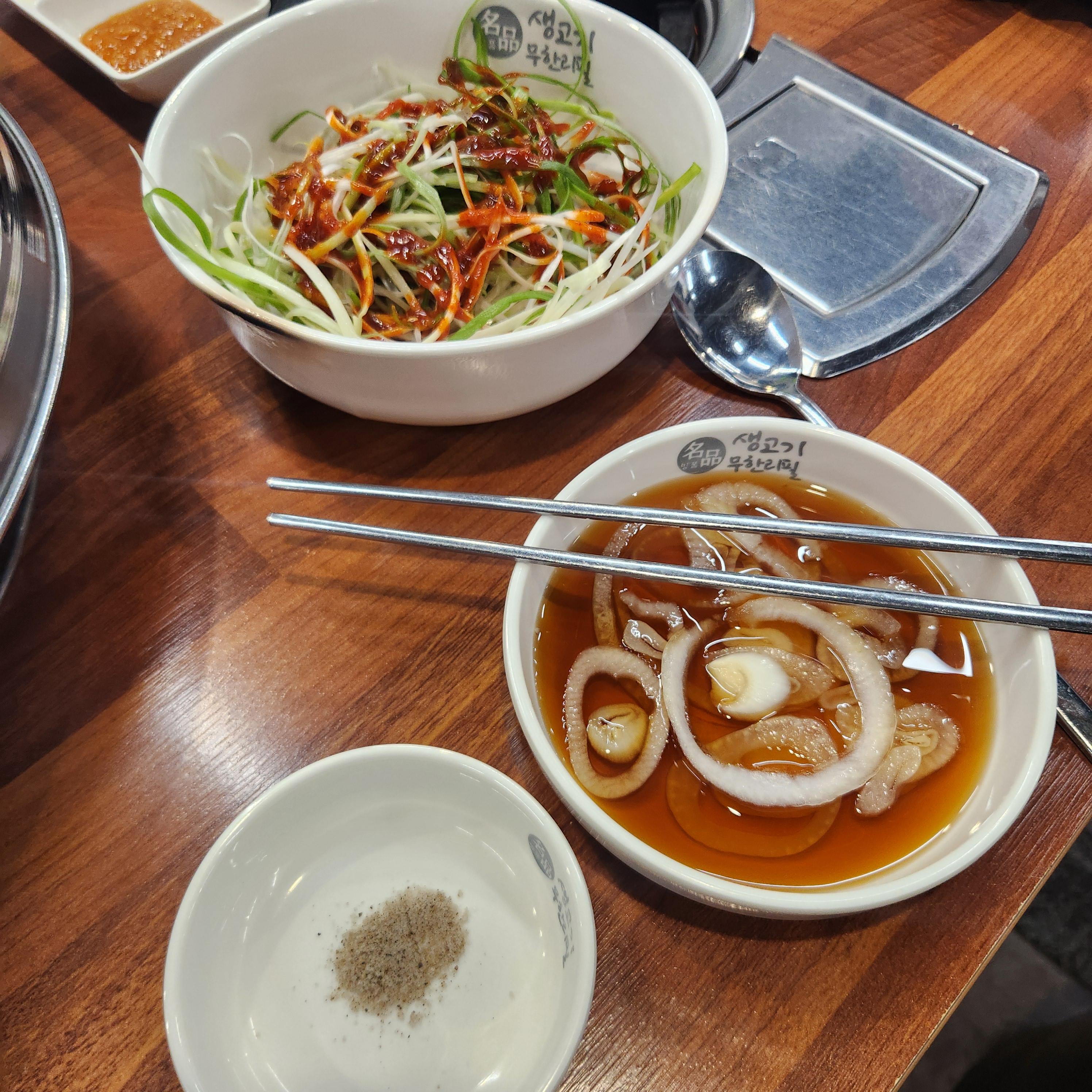 밑반찬은 처음에 많이 세팅을 안 해주십니다. 파절임, 양파소스 조금 나오고요