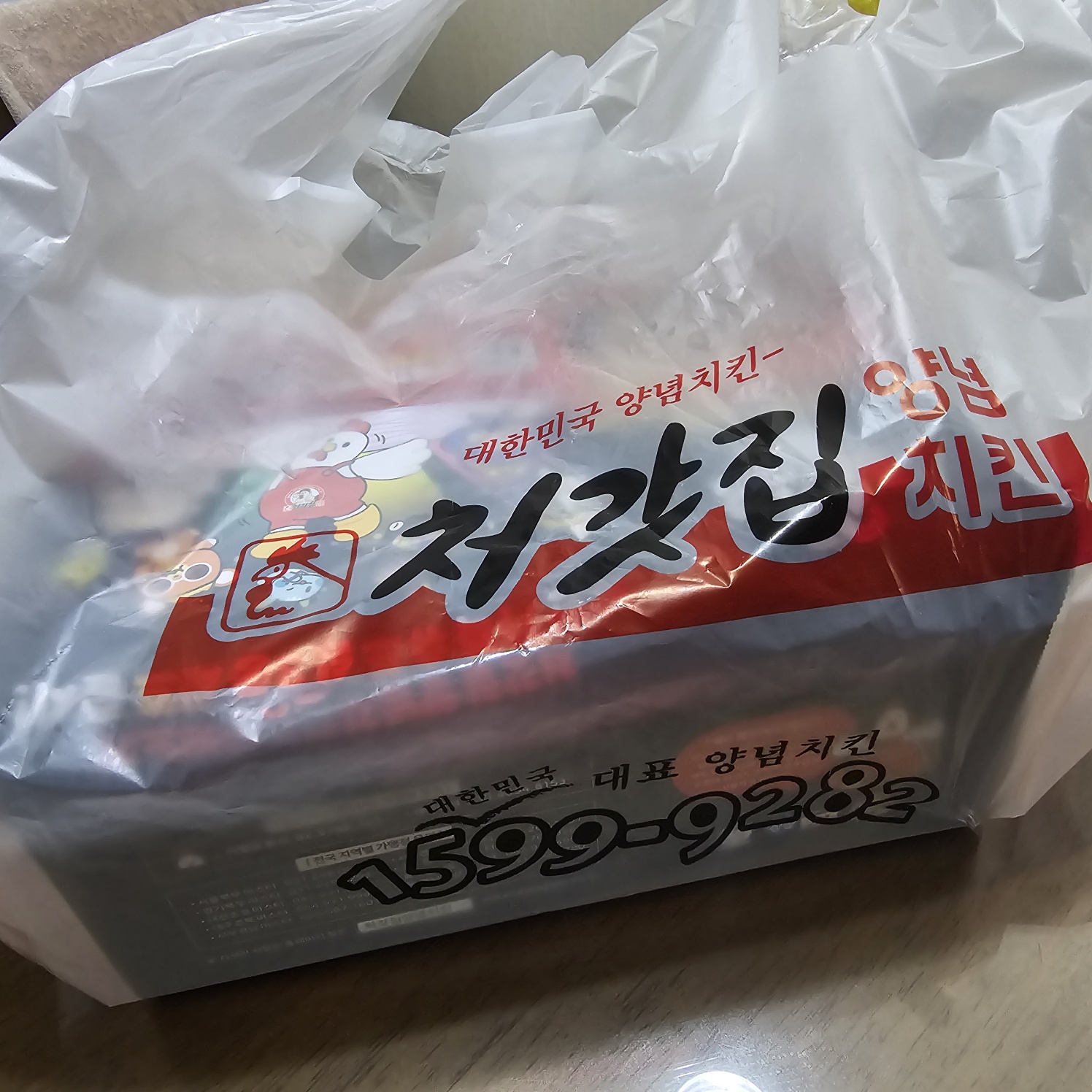 한결같은 처갓집 포장 봉투에 색감이 다채로운 치킨 박스가 나옵니다.