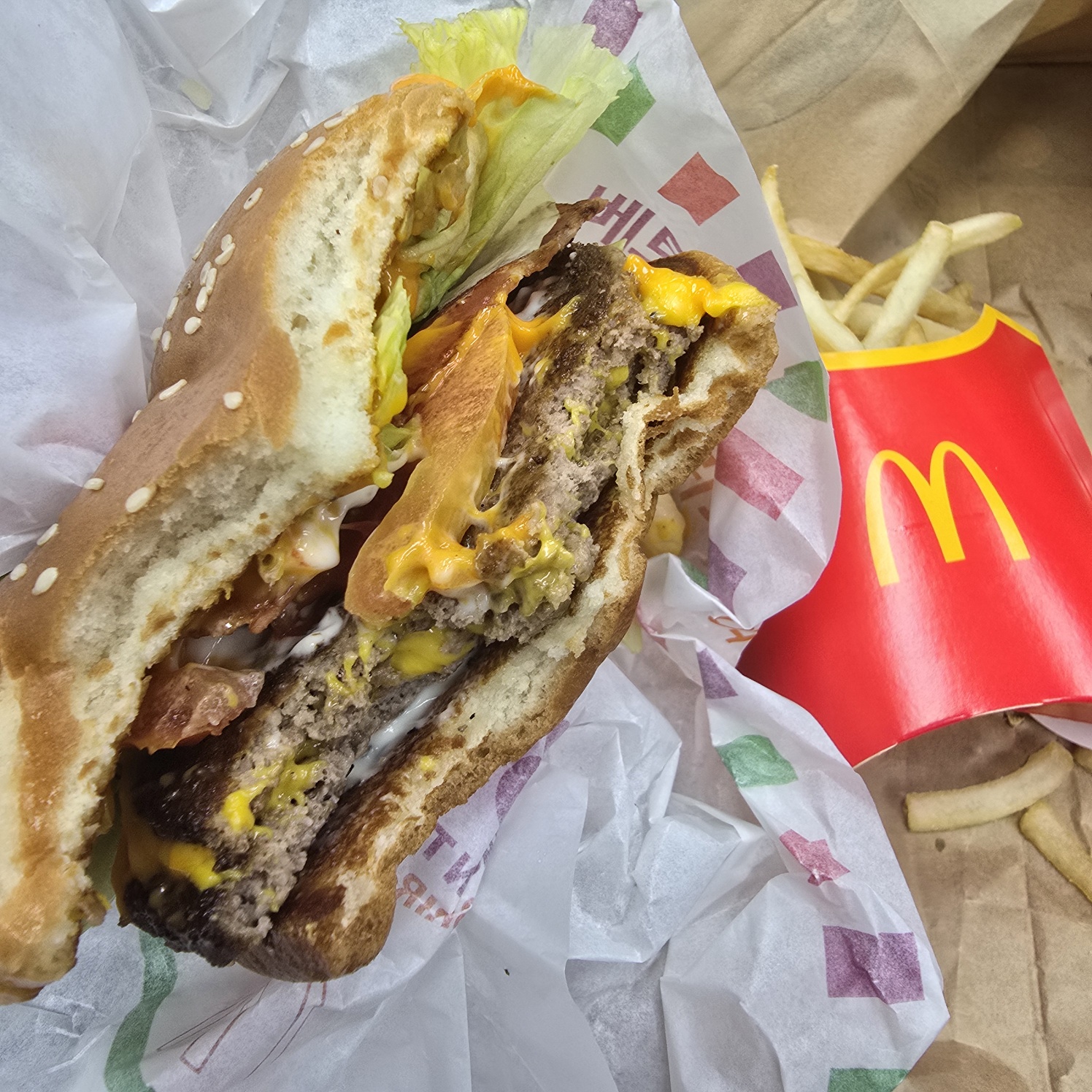 고기 패티 2장, 바싹 익혀진 베이컨, 토마토와 양상추 듬뿍 있습니다,