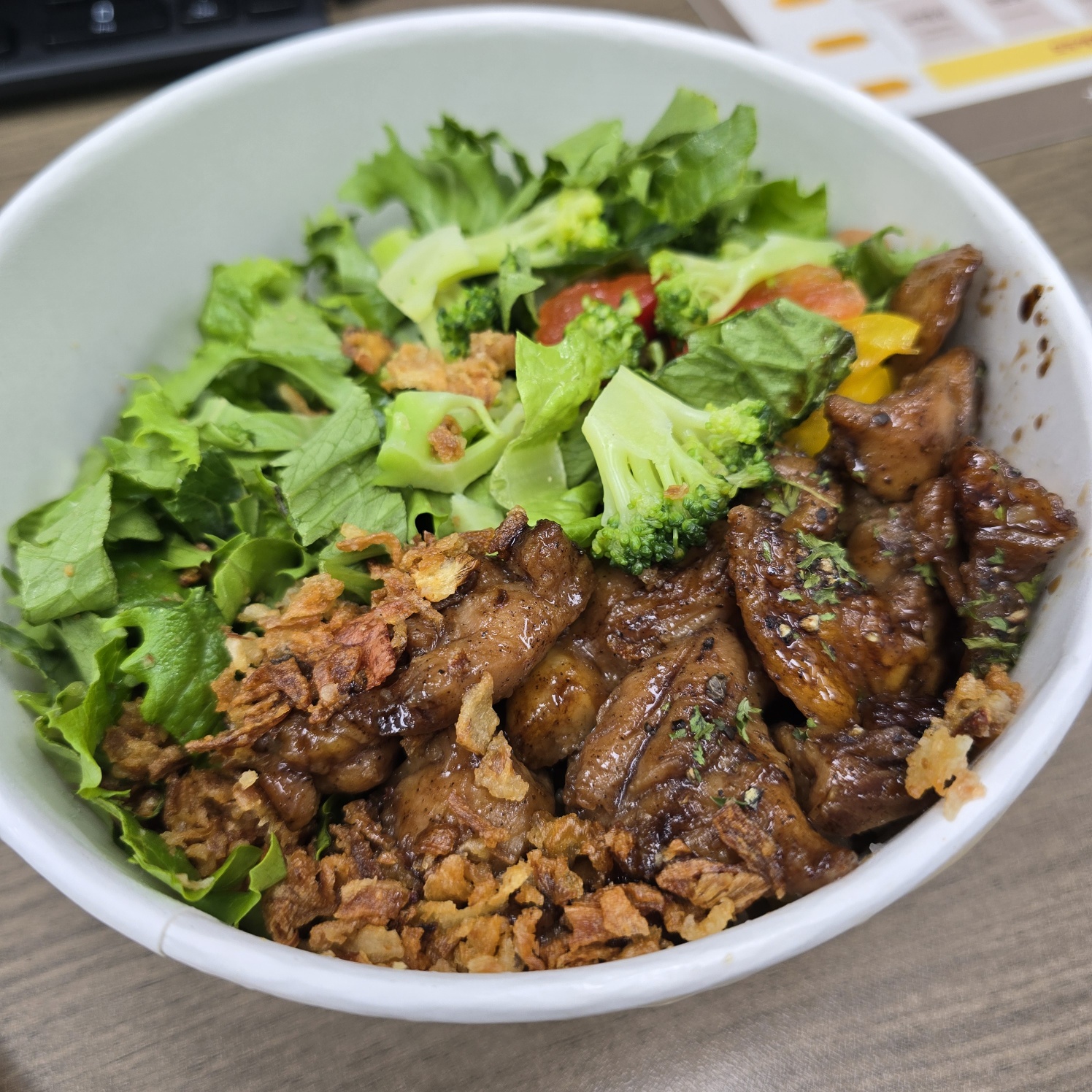 푸른색 채소와, 피망, 브로콜리, 양념에 졸여진 닭다리살들, 마늘 후레이크와 콩이 야무지게 담겨있네요! 전반적으로 색감하고 밸런스가 좋아 보입니다~