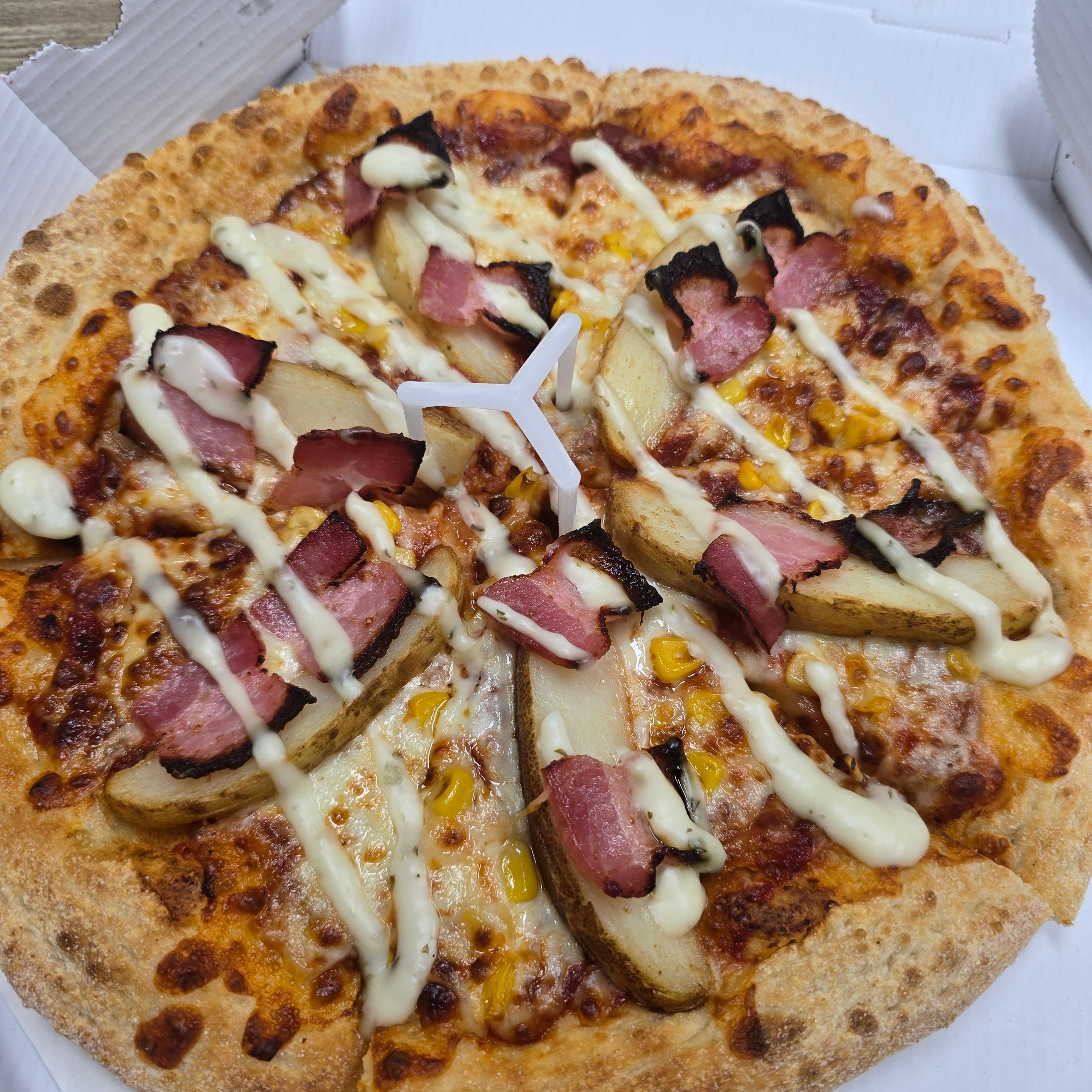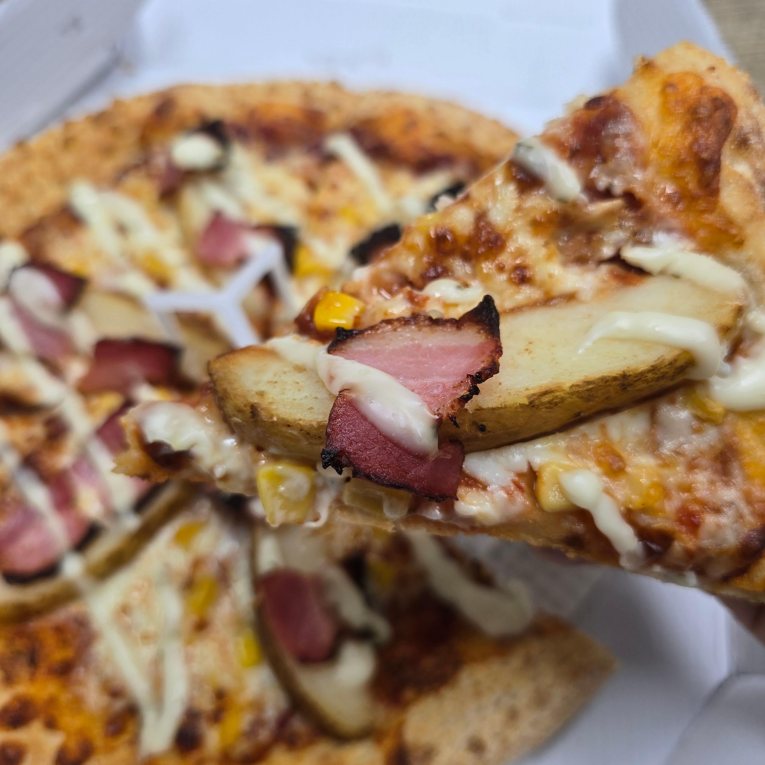 옥수수, 웨지감자, 베이컨 빼놓을 수 없는 기본 토핑들과 뭔 지 모를 소스가 같이 더해져서