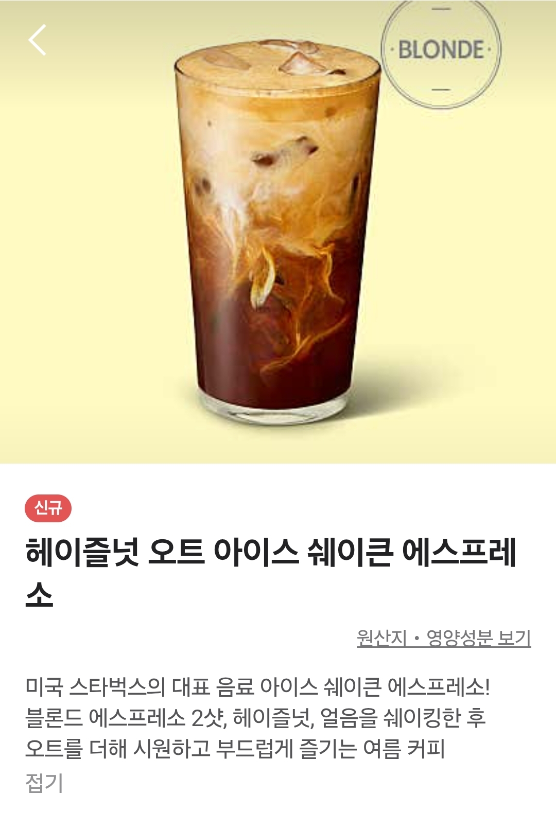 제가 오늘 포스팅 해 볼 음료는 따끈한 스벅 신메뉴 '헤이즐넛 오트 아이스 쉐이큰 에스프레소'입니다~