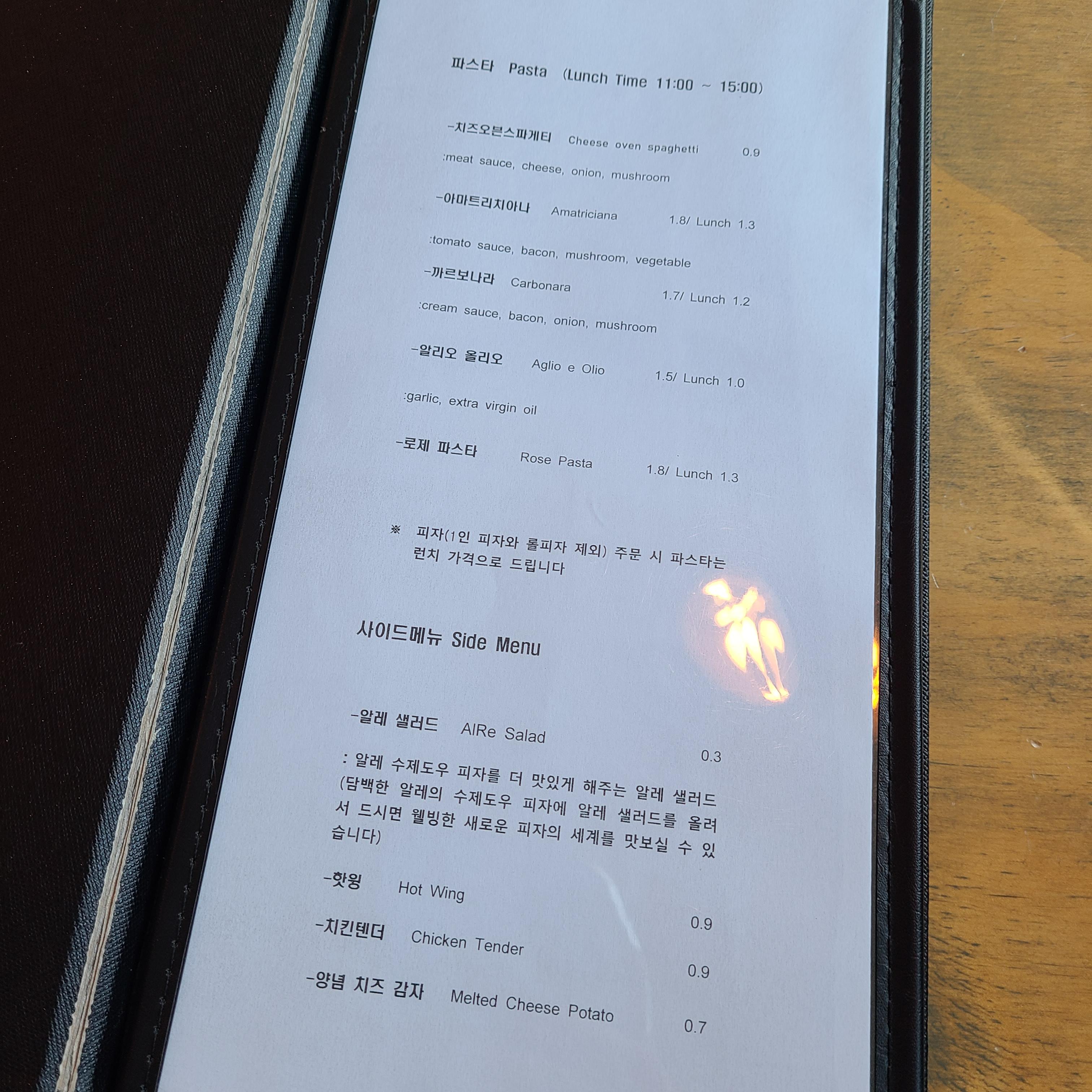 메뉴는 크게 피자 , 파스타 , 사이드메뉴 구성돼있어요