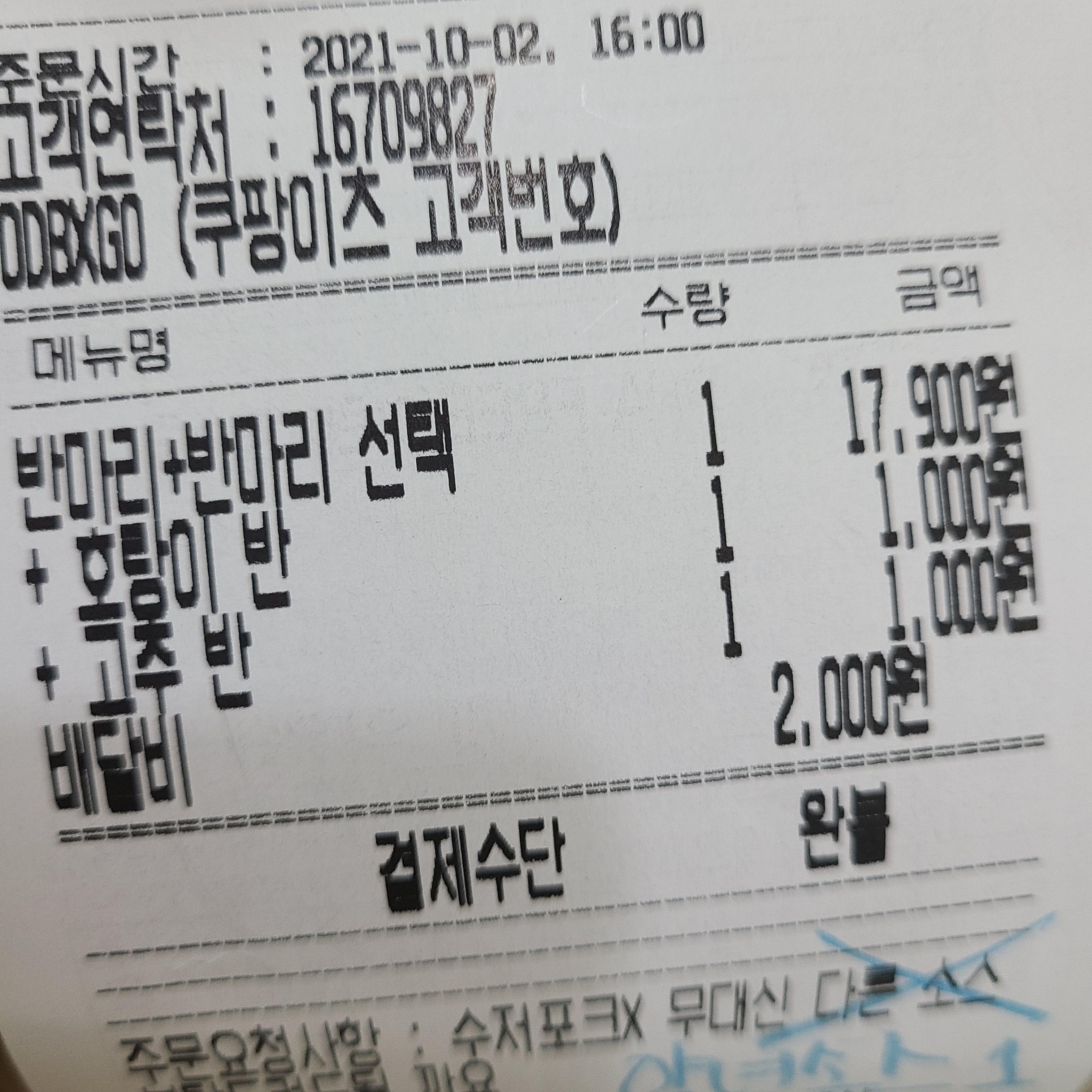 쿠팡 이츠로 주문했습니다.