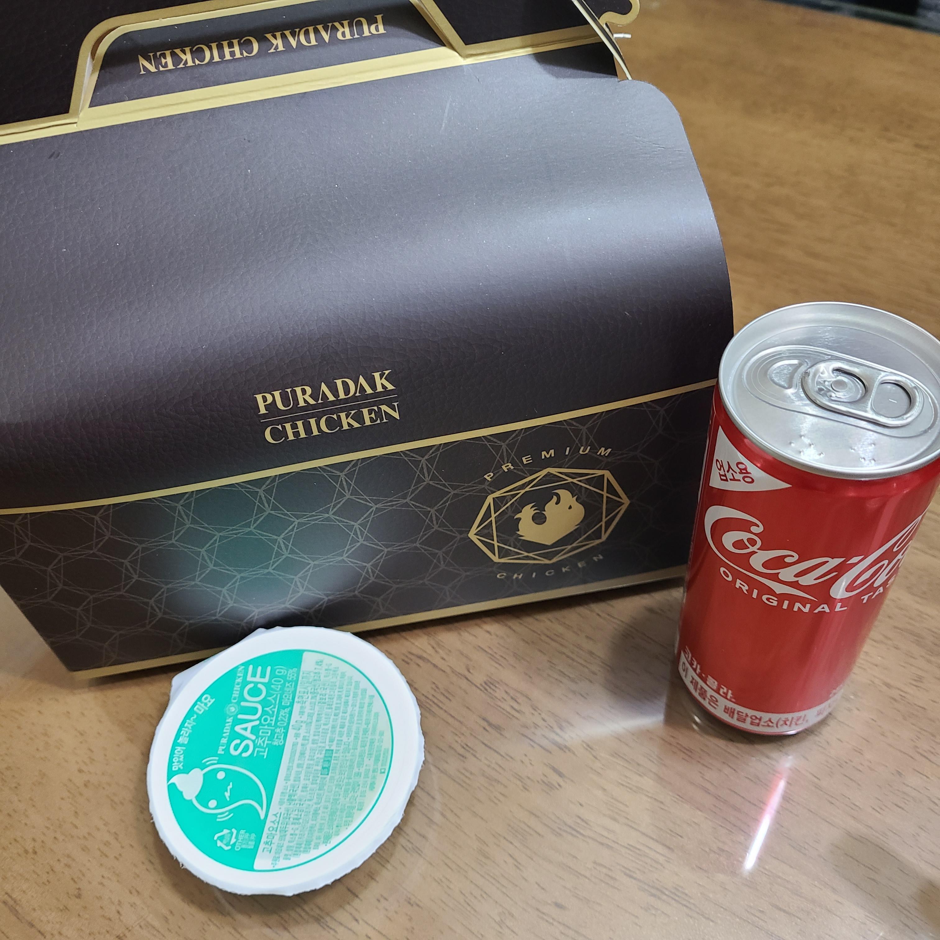 콘소메이징 치킨 + 코카콜라 250ml 캔 + 고추 마요 소스 + 치킨 무
