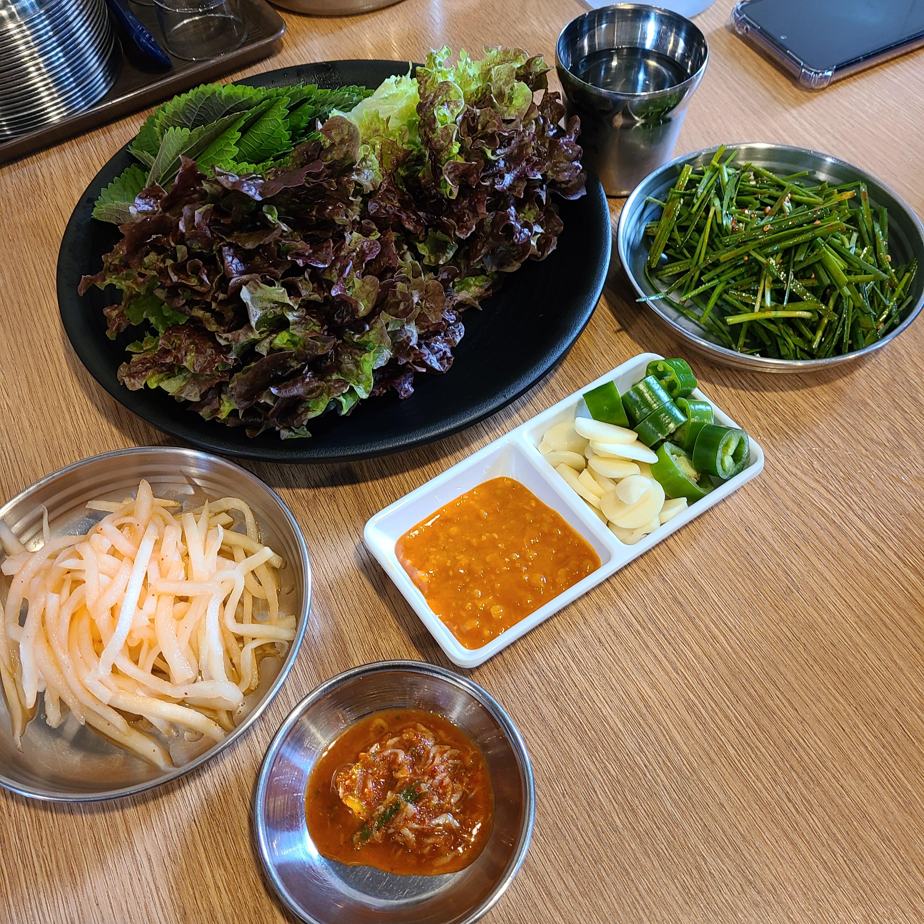 상추와 깻잎과 무체와 부추무침! 그리고 순두부 찌개가 나옵니다.
